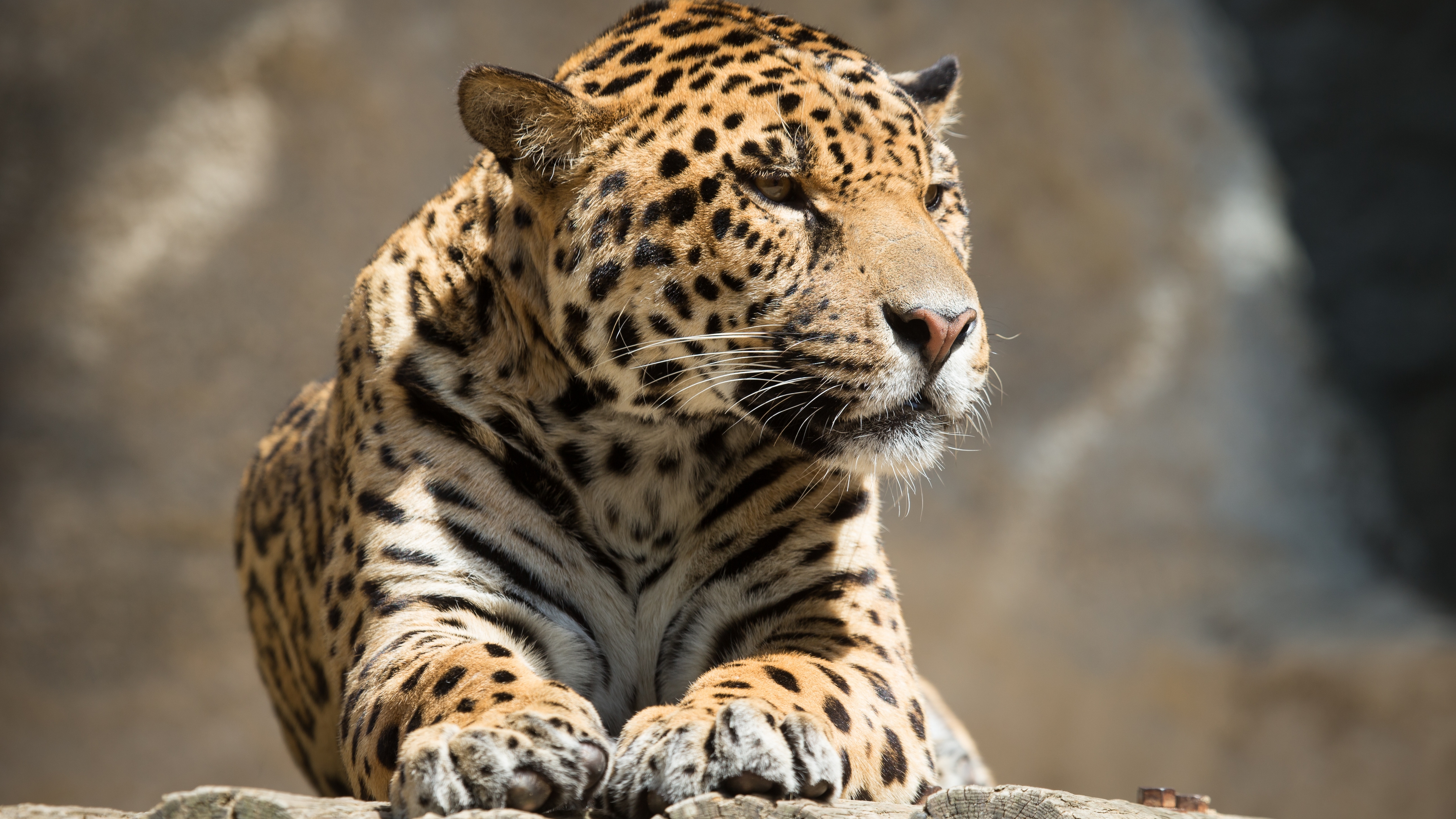Description: A large leopard laying on top of a rock covered ground next to a rock wall and a rock wall.