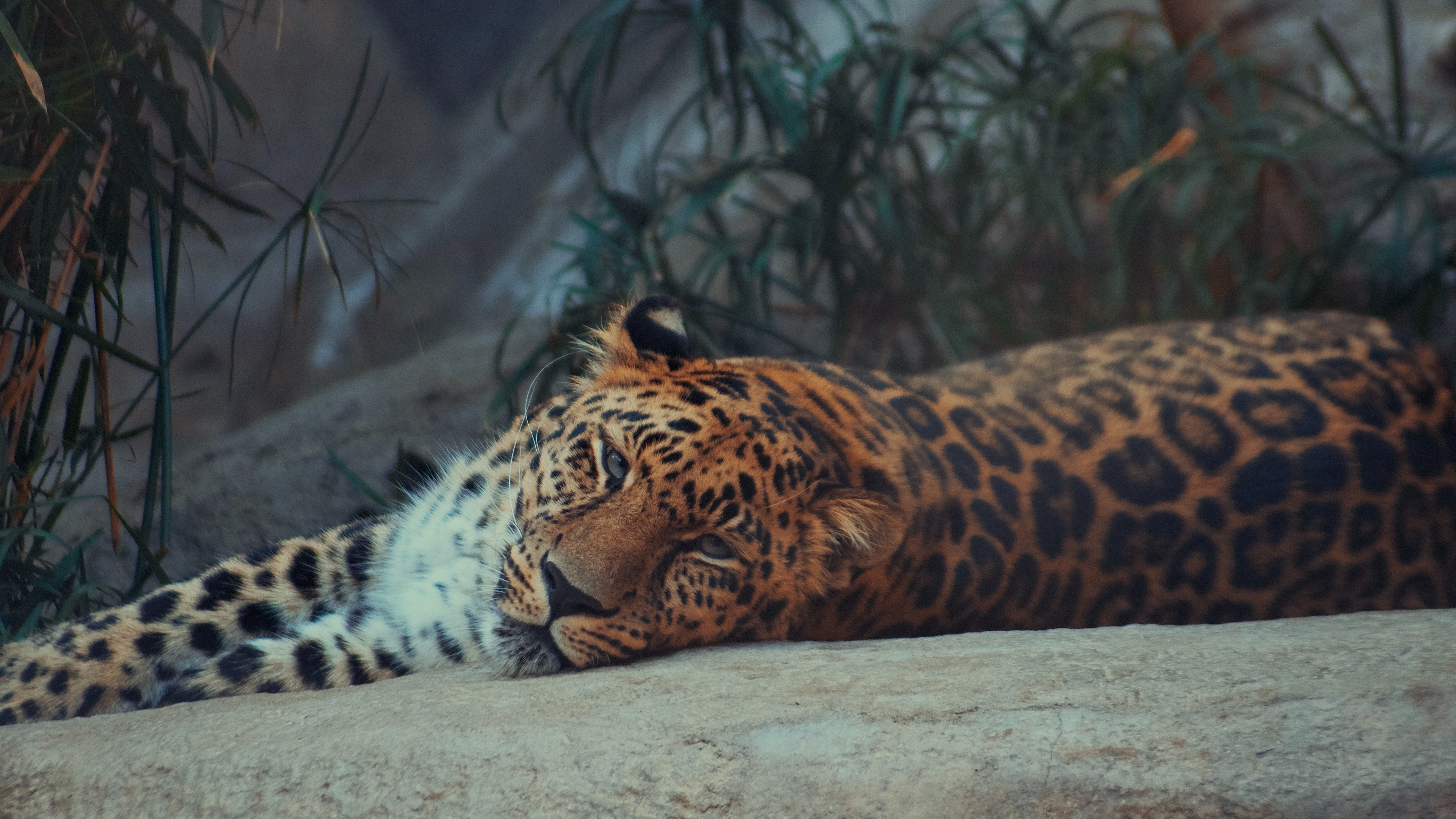 Description: A leopard laying on a rock next to some plants and rocks and grass in the background.
