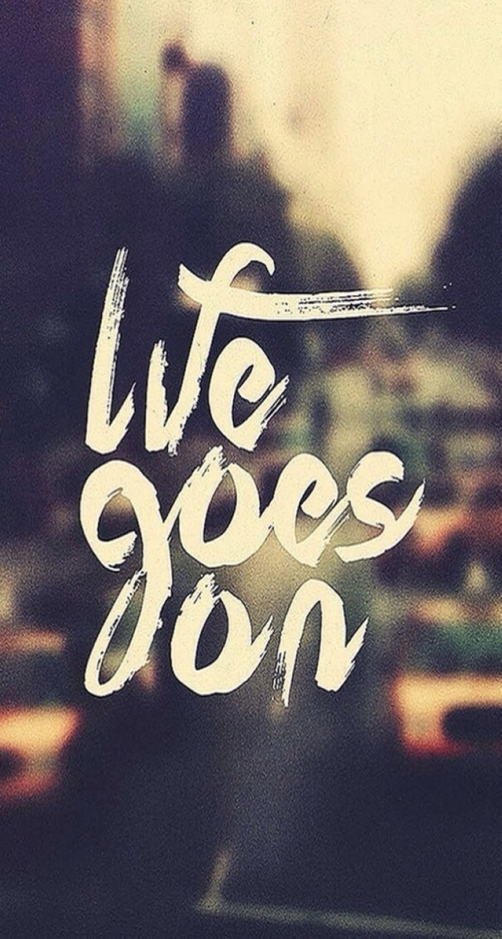 Description: A blurry photo of a city street with the words life goes on written in white ink on a glass.