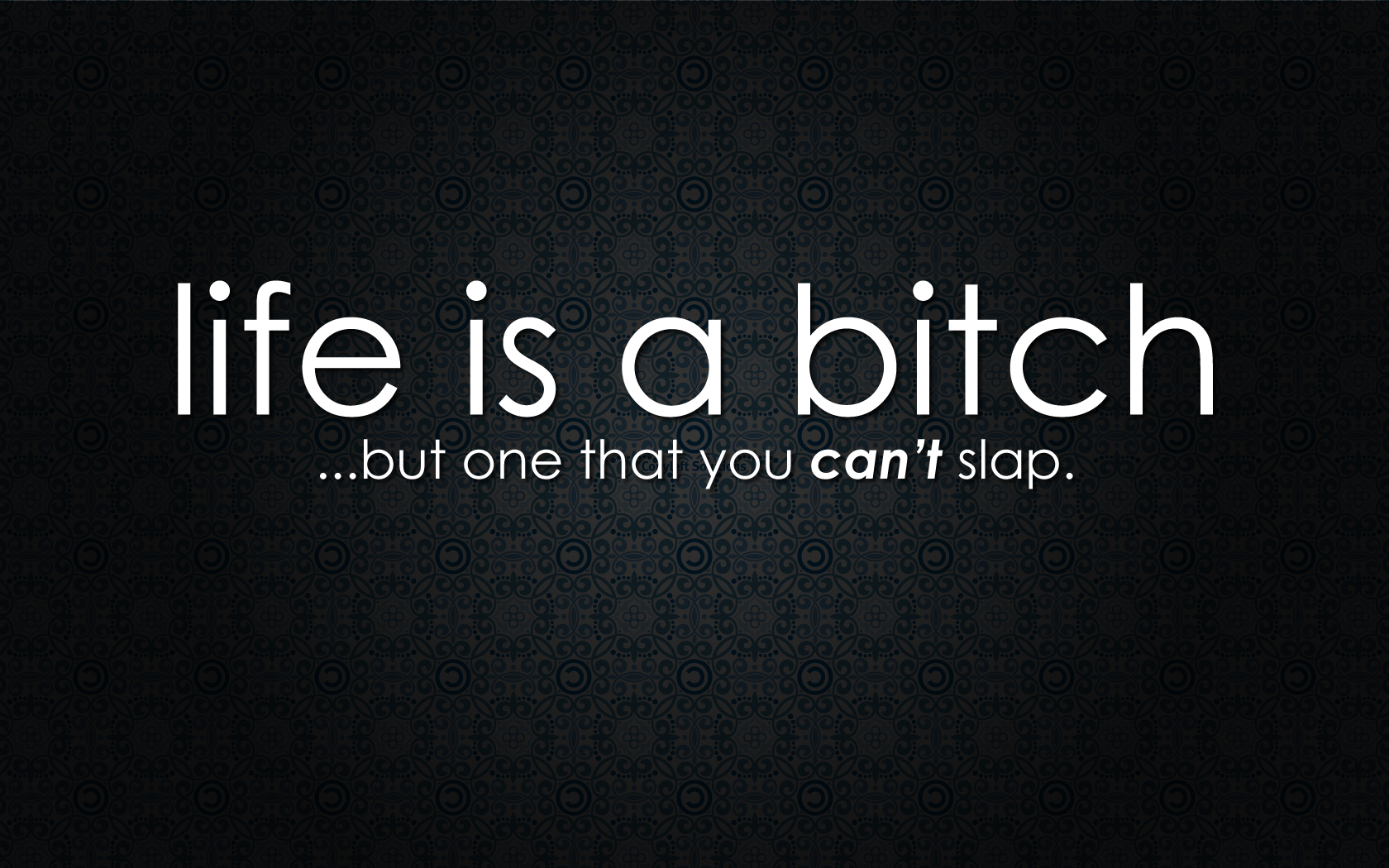 Description: A black background with a white text that says life is a bitch but one that you can't slap.