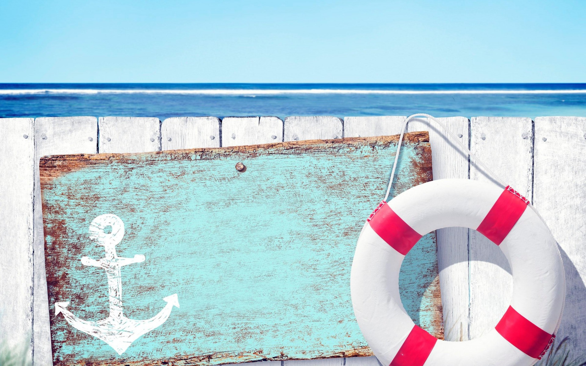 Description: A life preserver and a life preserver on a wooden wall near the ocean with a sign that says.