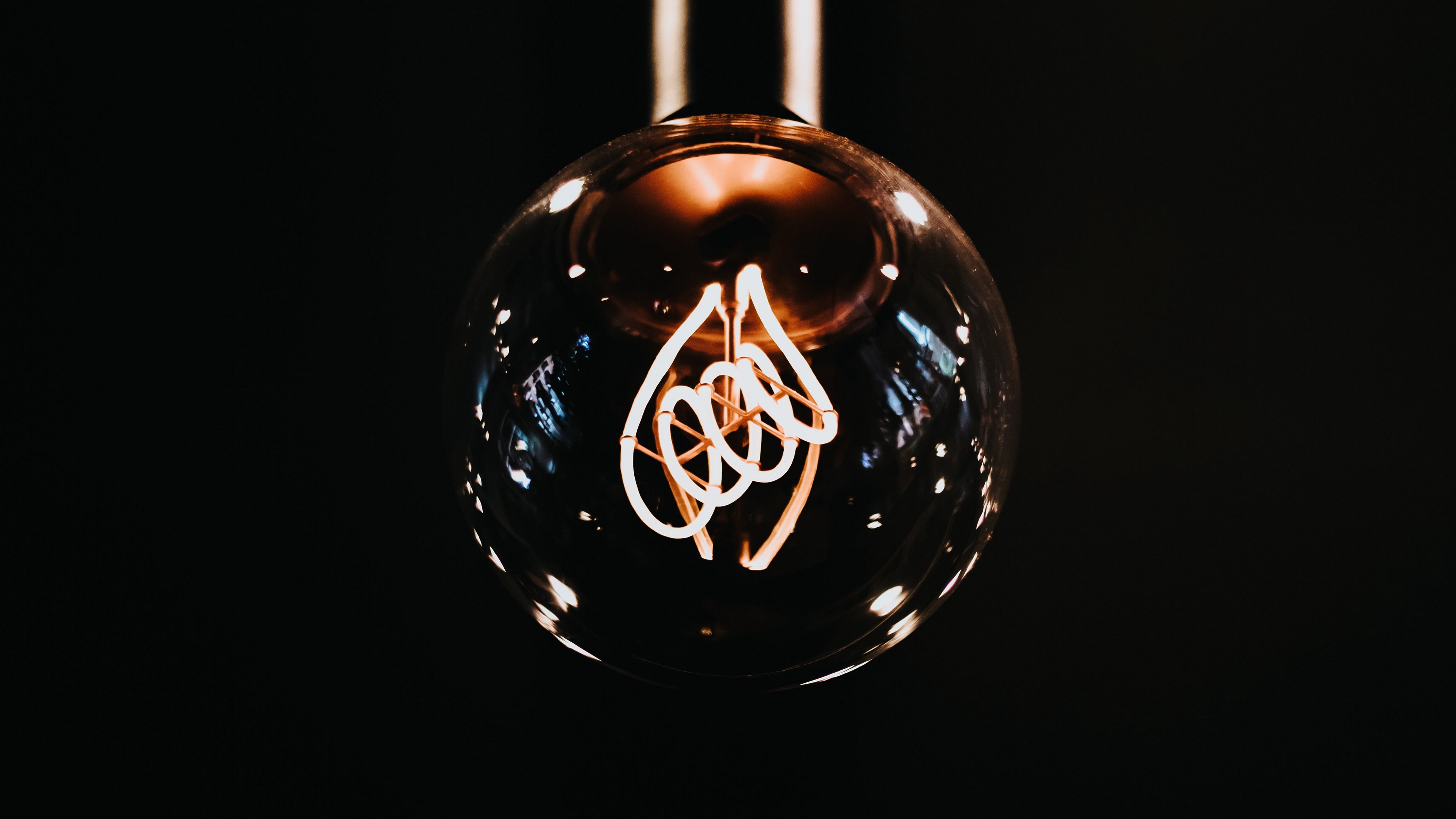 Description: A light bulb with a string attached to it in the dark room with a black background and a white light bulb.
