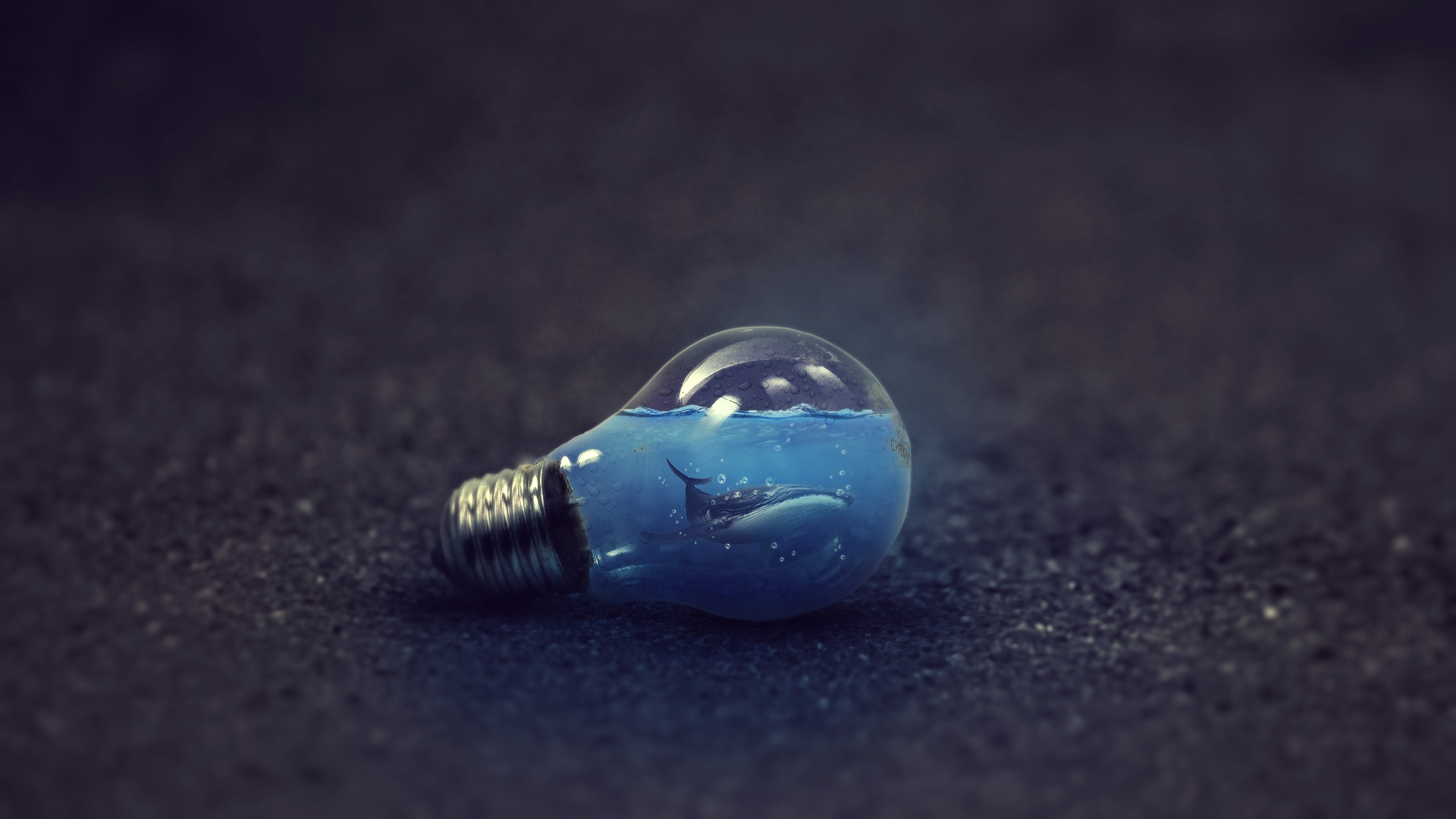 Description: A light bulb with a shark inside of it on a black surface with a black background and a small light bulb with a shark inside of it.
