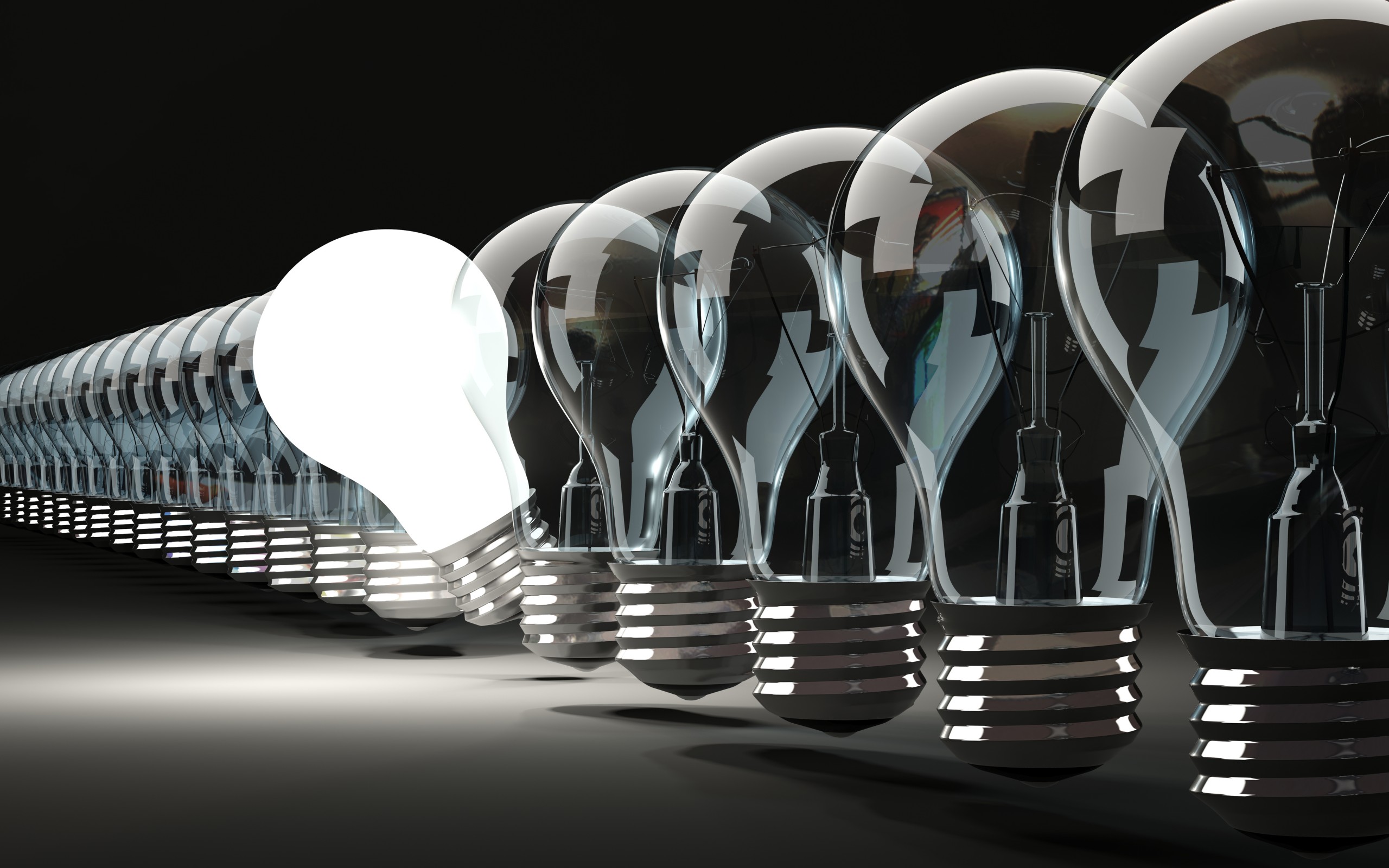 Description: A row of light bulbs sitting next to each other on a black surface with a black background and a white light bulb.