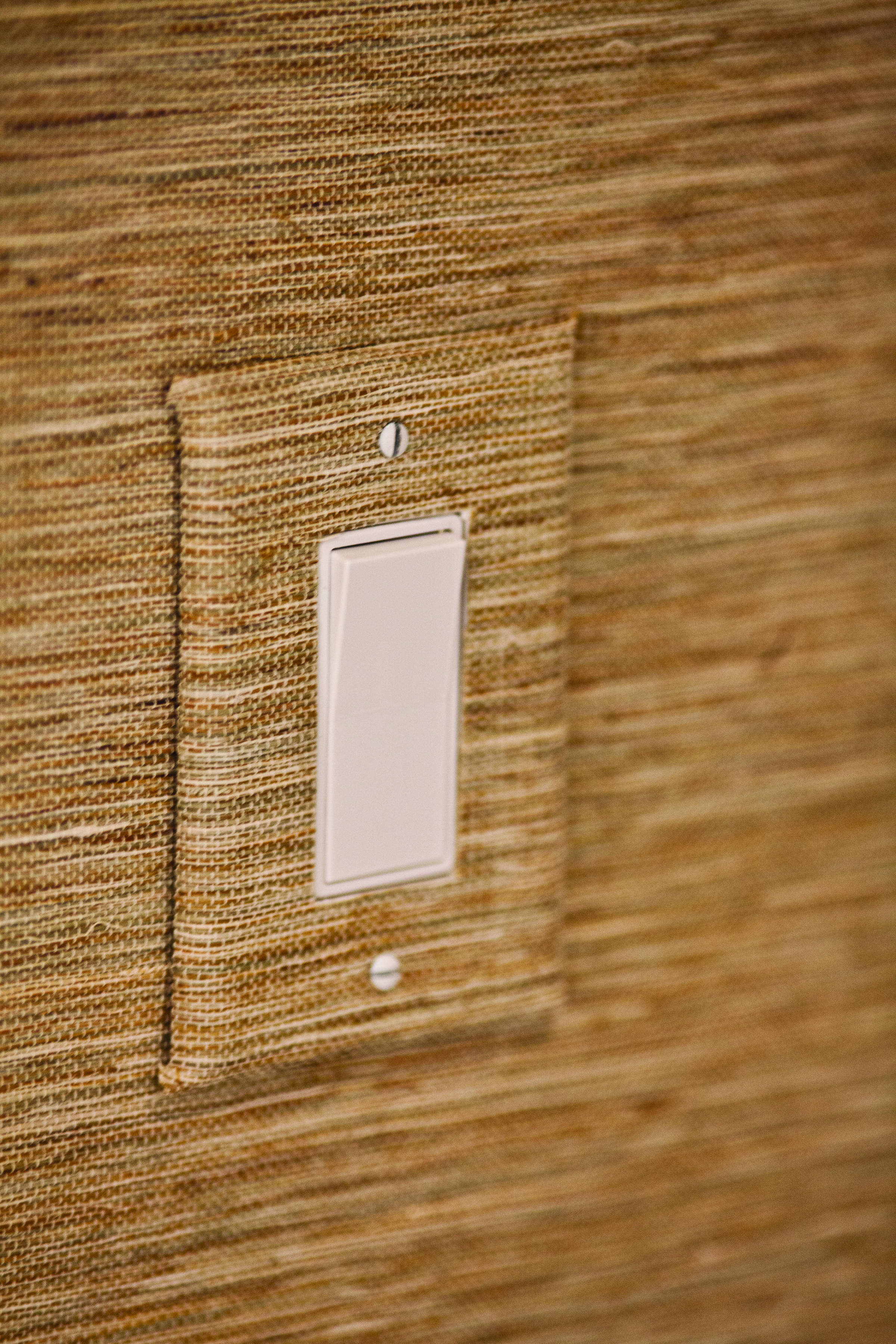 Description: A light switch is mounted on a wall made of straw grass material with a white light switch plate in the center.