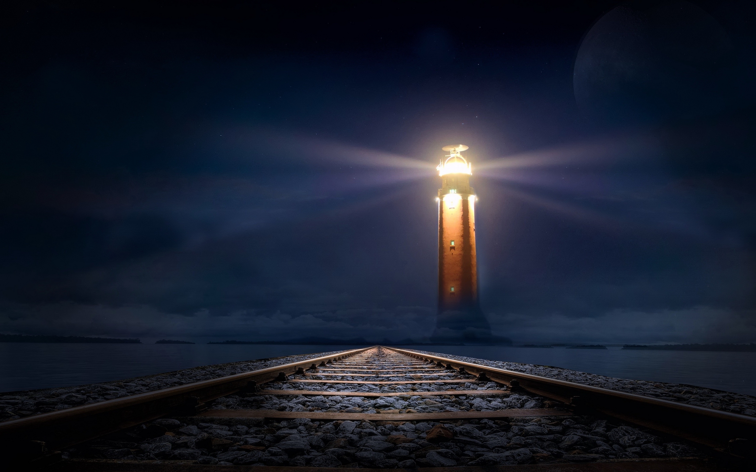 Description: A light tower sitting on top of a train track at night time with a full moon in the background.