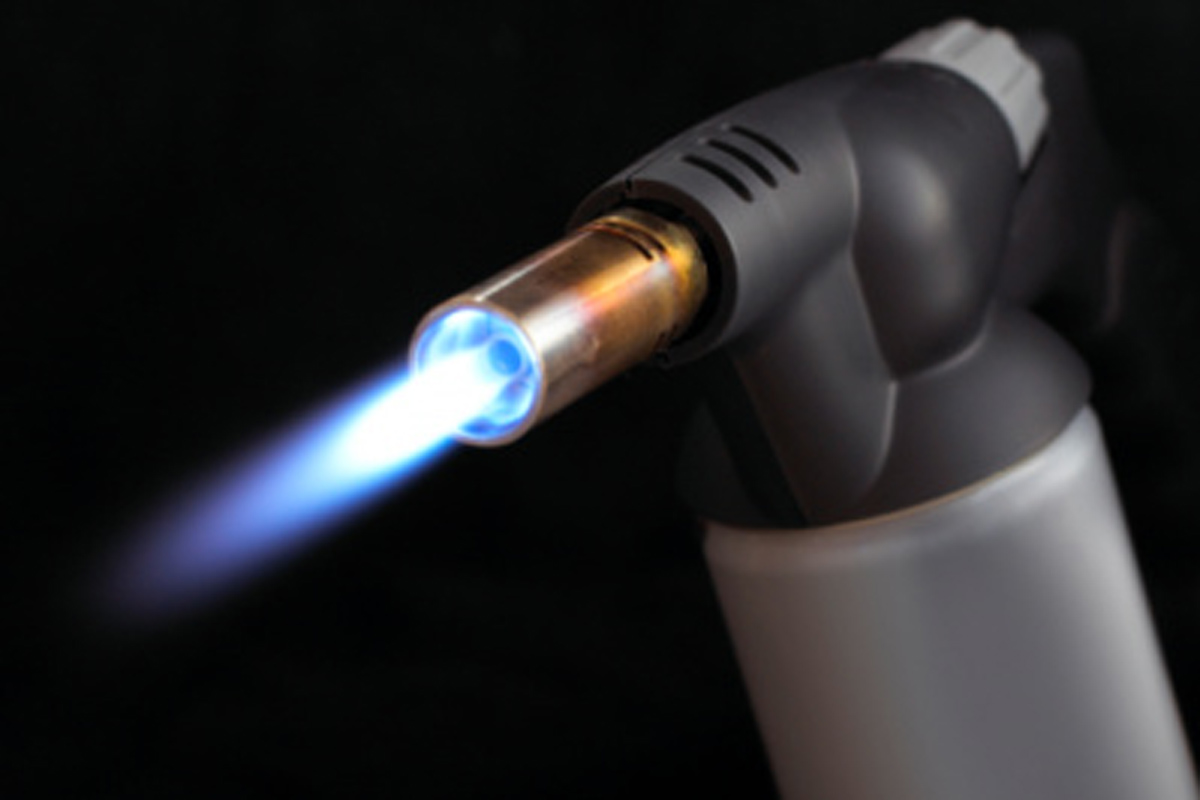 Description: A lighter with a blue light coming out of it's end cap on a black background with a black background.