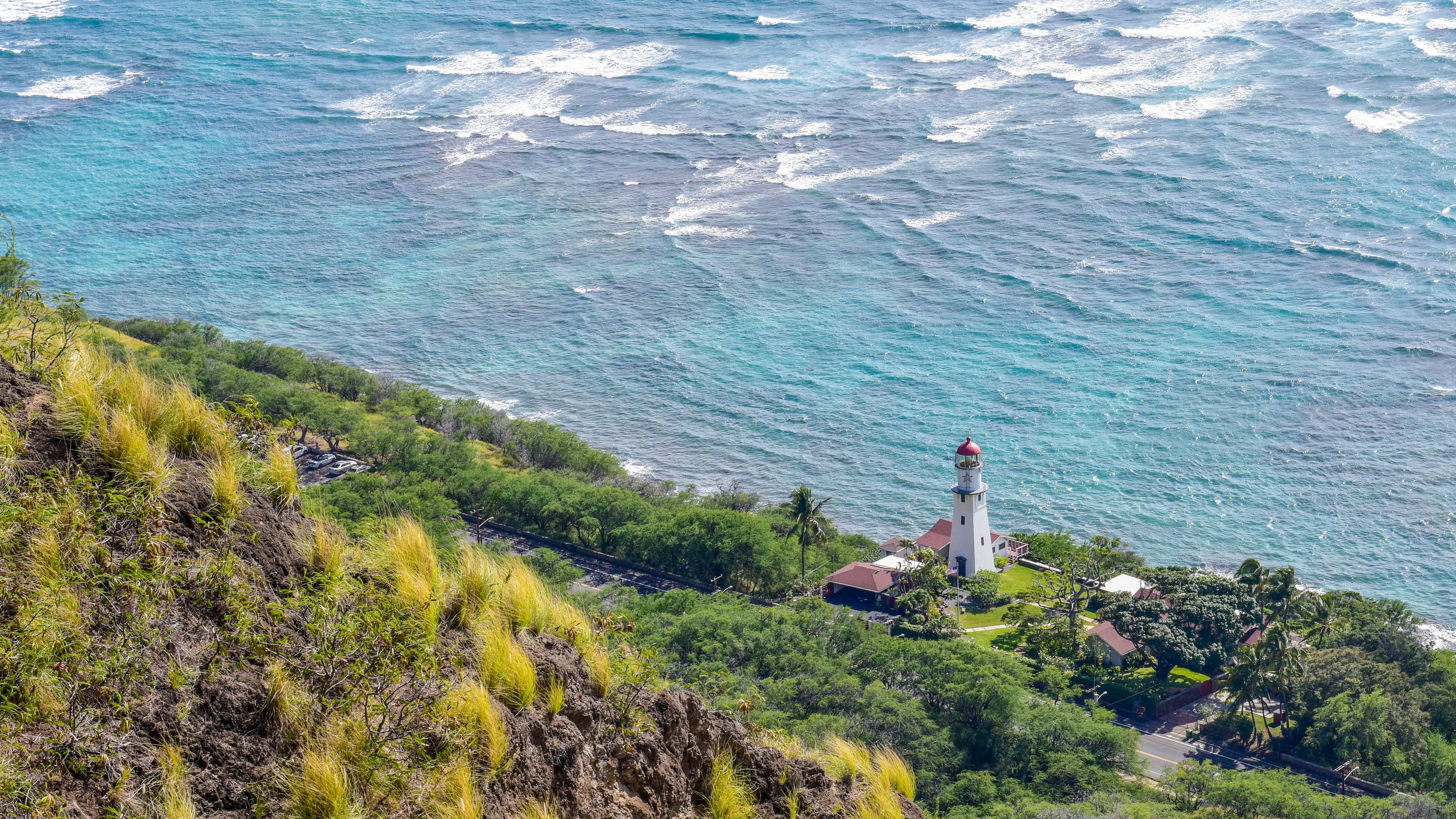 Description: A lighthouse on a cliff overlooking the ocean and a beach with a boat in the water and a house on the cliff.