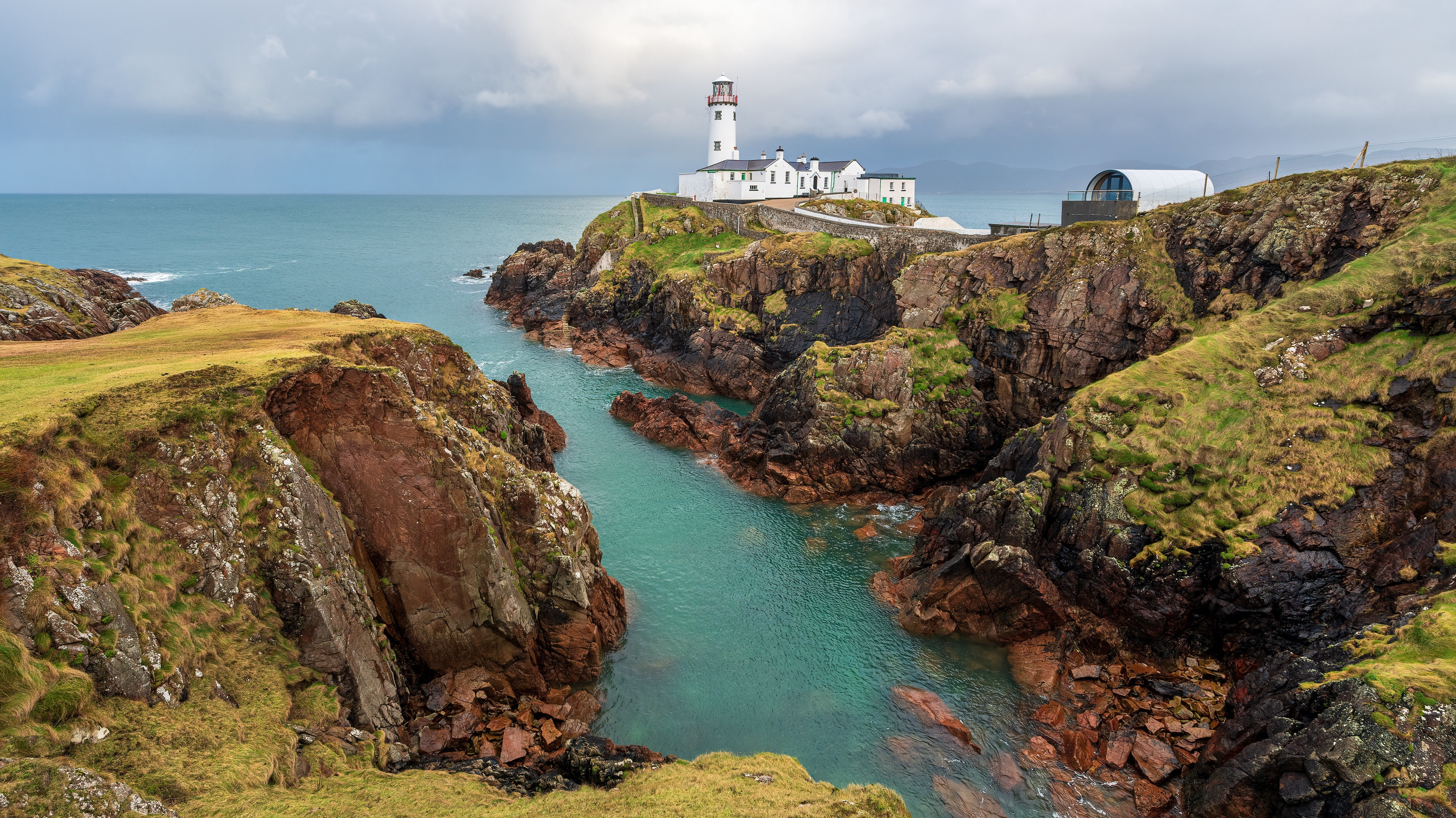 Description: A lighthouse on a rocky cliff overlooking the ocean and a body of water with a boat in it and a cloudy sky.