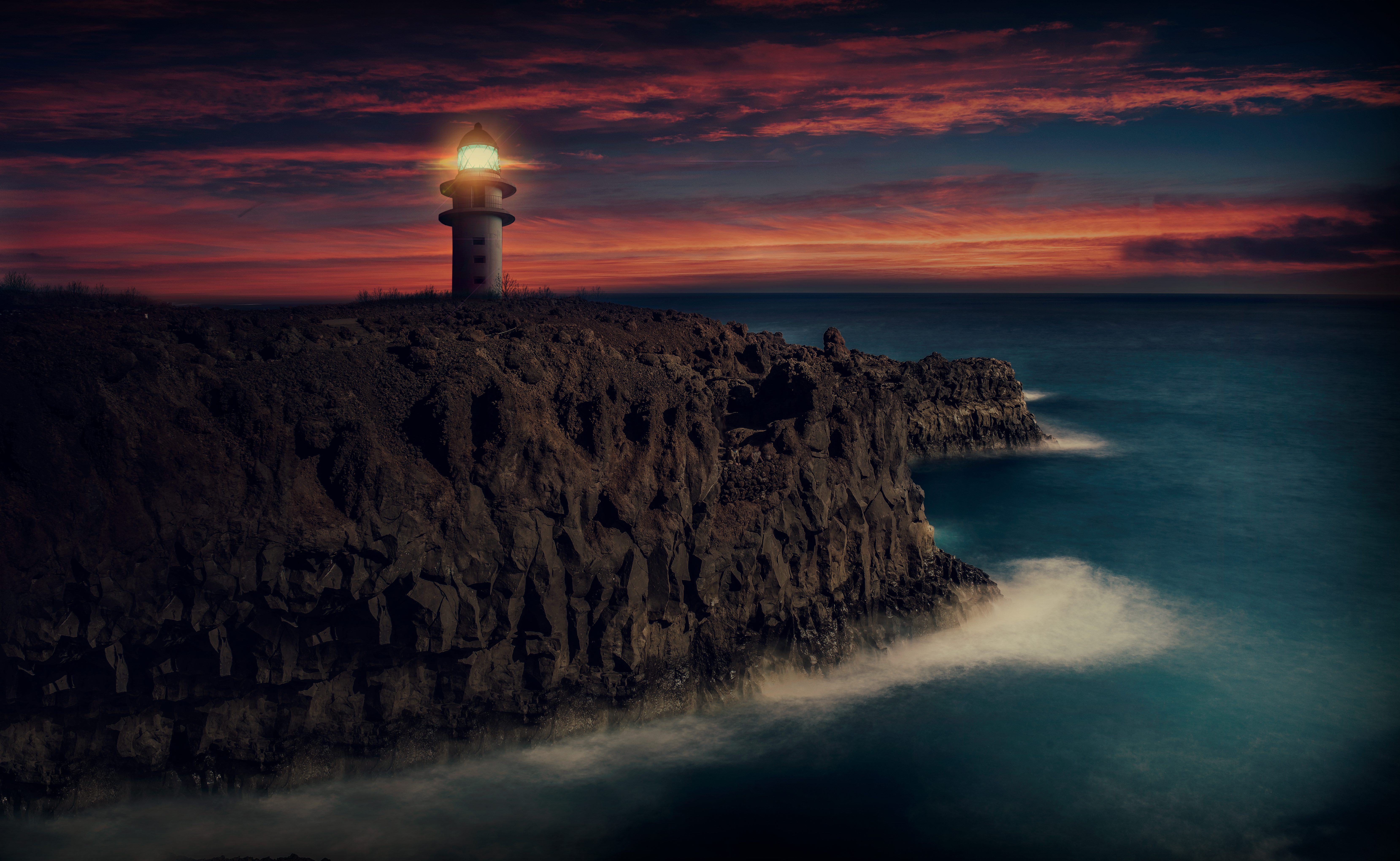 Description: A lighthouse on a cliff with a red sky in the background and a body of water below it with a light on top.
