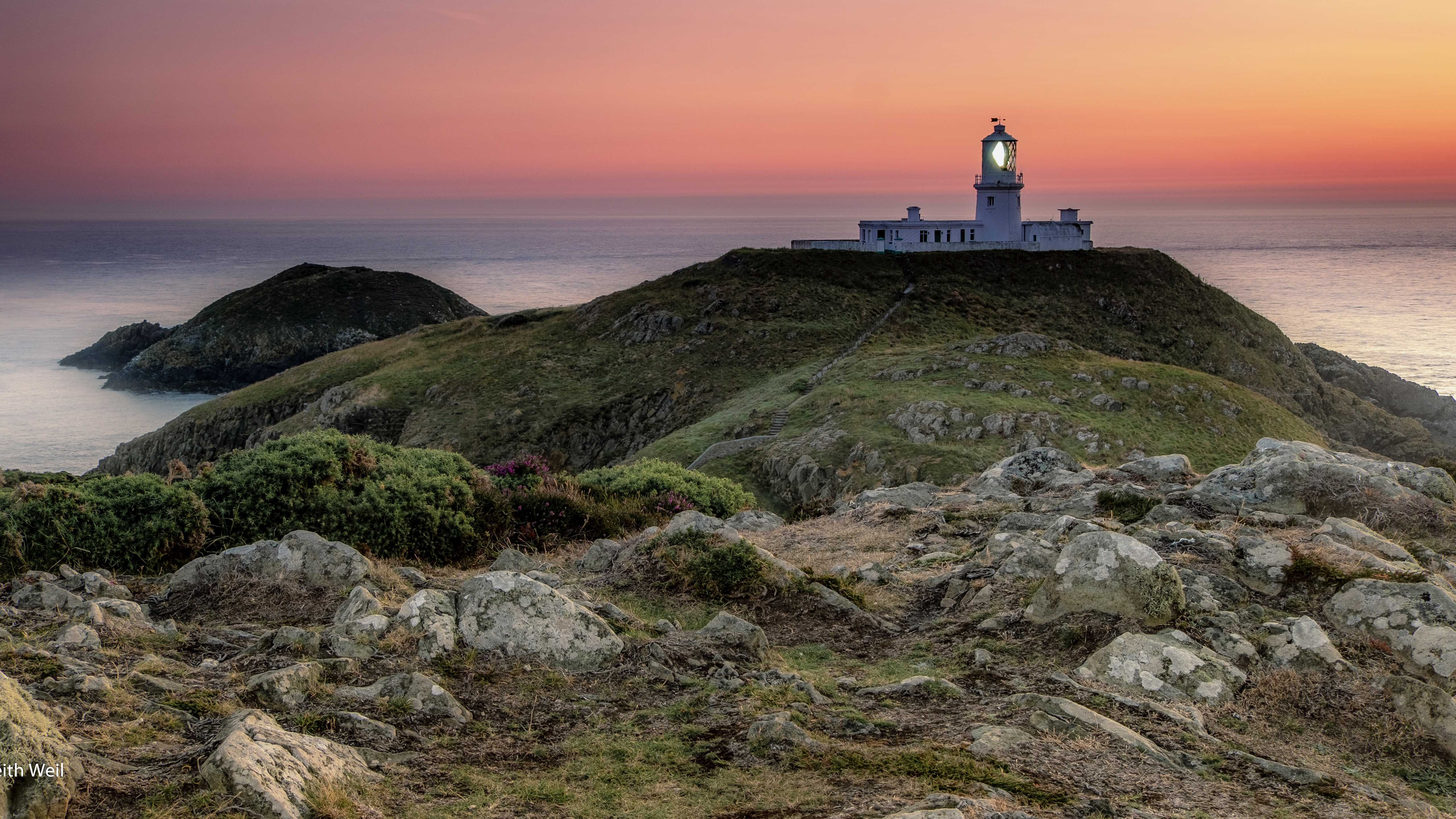 Description: A lighthouse on a small island with a sunset in the background and a body of water in the foreground.