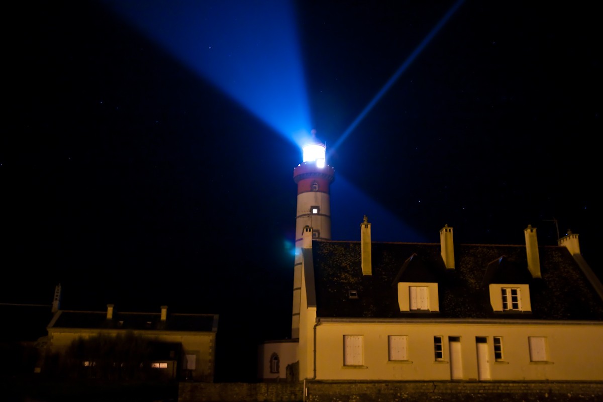 Description: A lighthouse with a light shining on it at night time with a building in the background with windows and shutters.