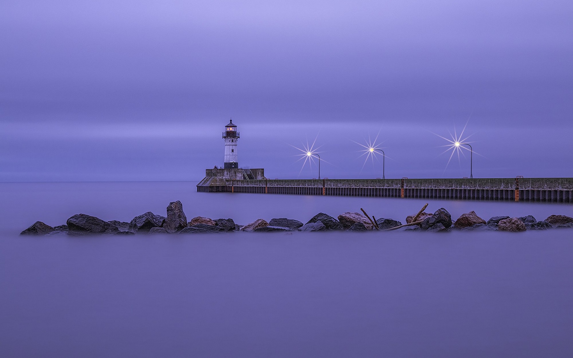 Description: A lighthouse on a pier with a purple sky in the background and a few rocks in the foreground.