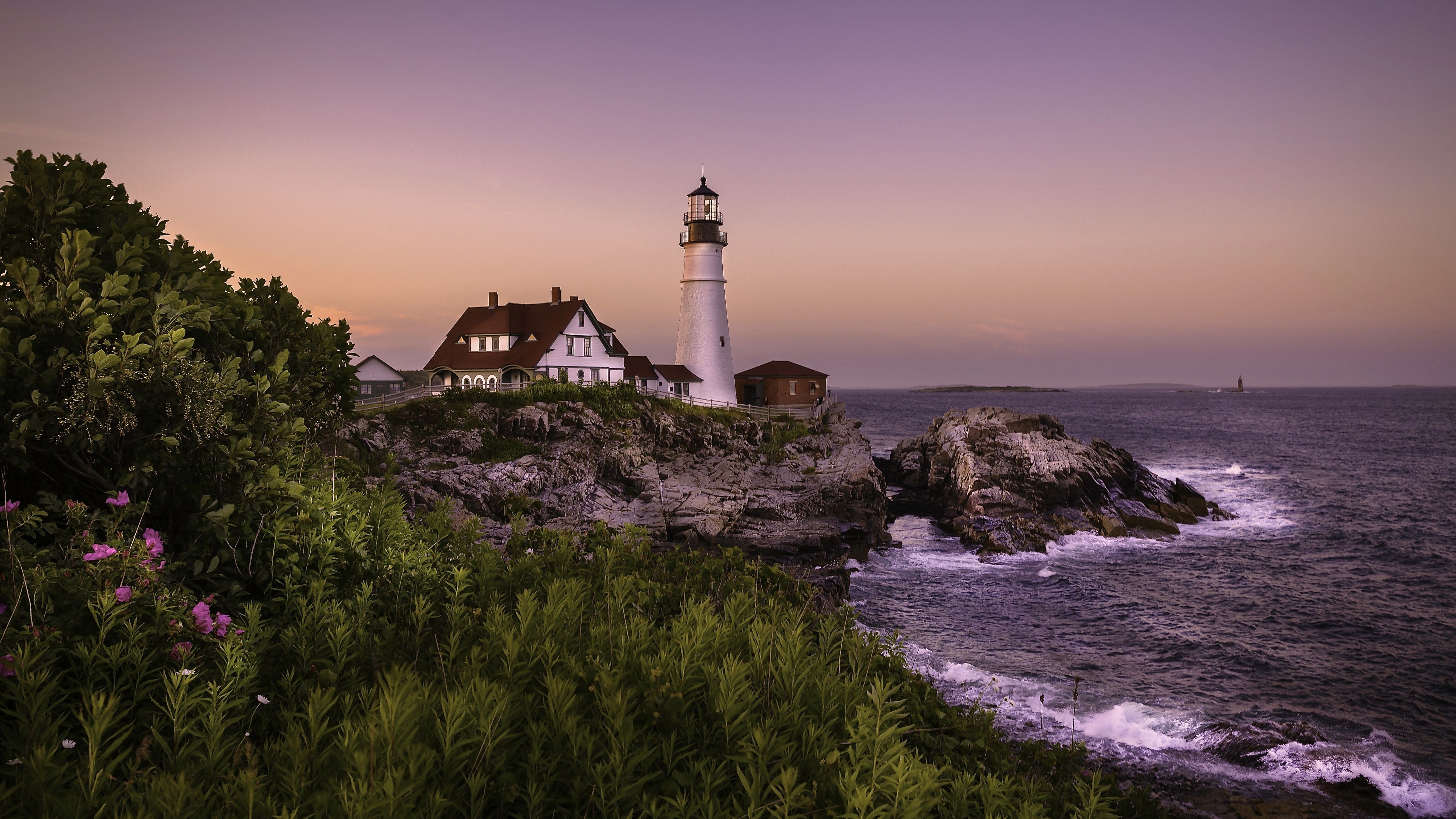 Description: A lighthouse on a rocky cliff near the ocean at sunset with a pink sky and purple clouds above it.