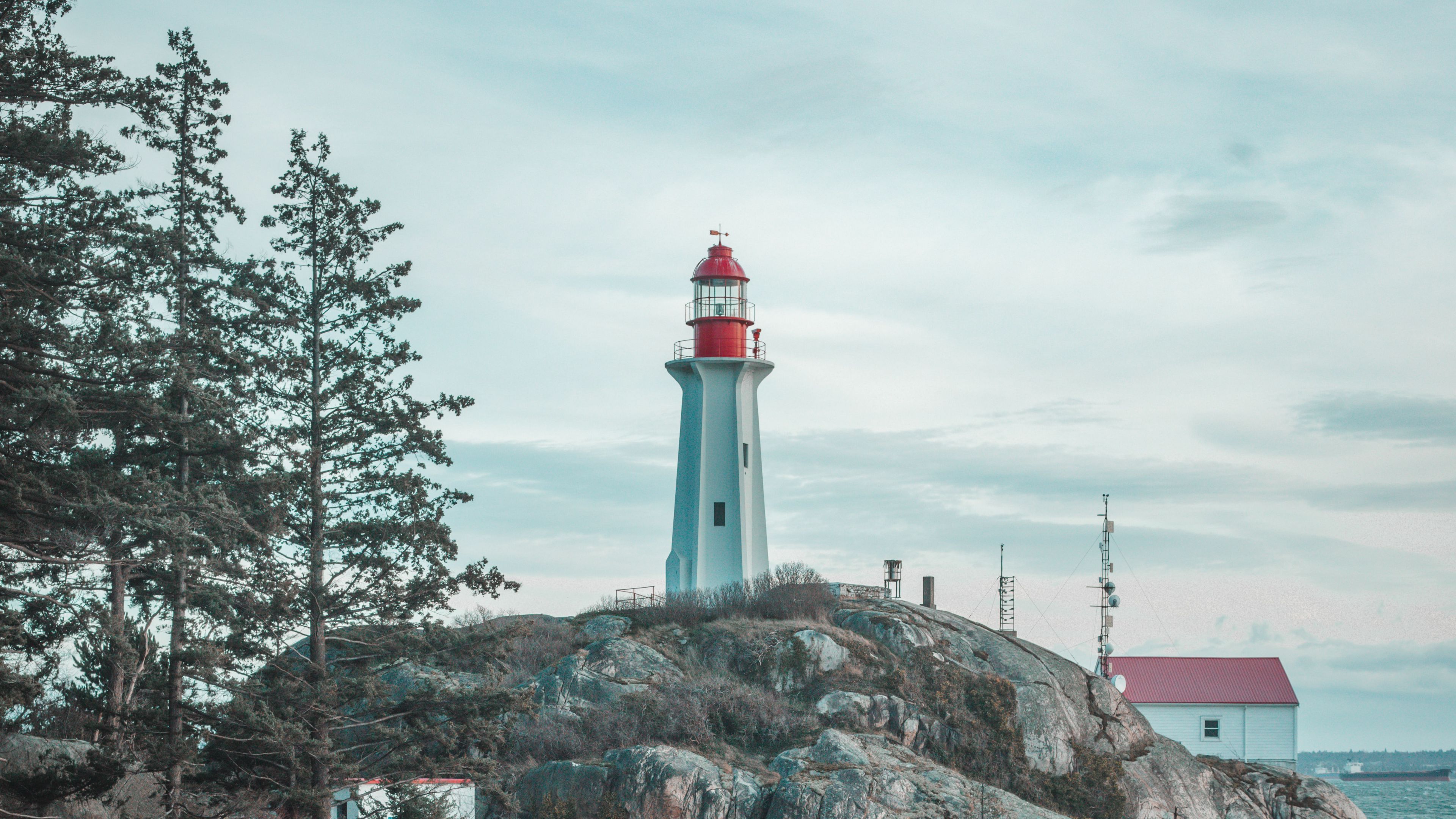 Description: A lighthouse on a rocky outcropping with a red roof and a red roof on top of it.