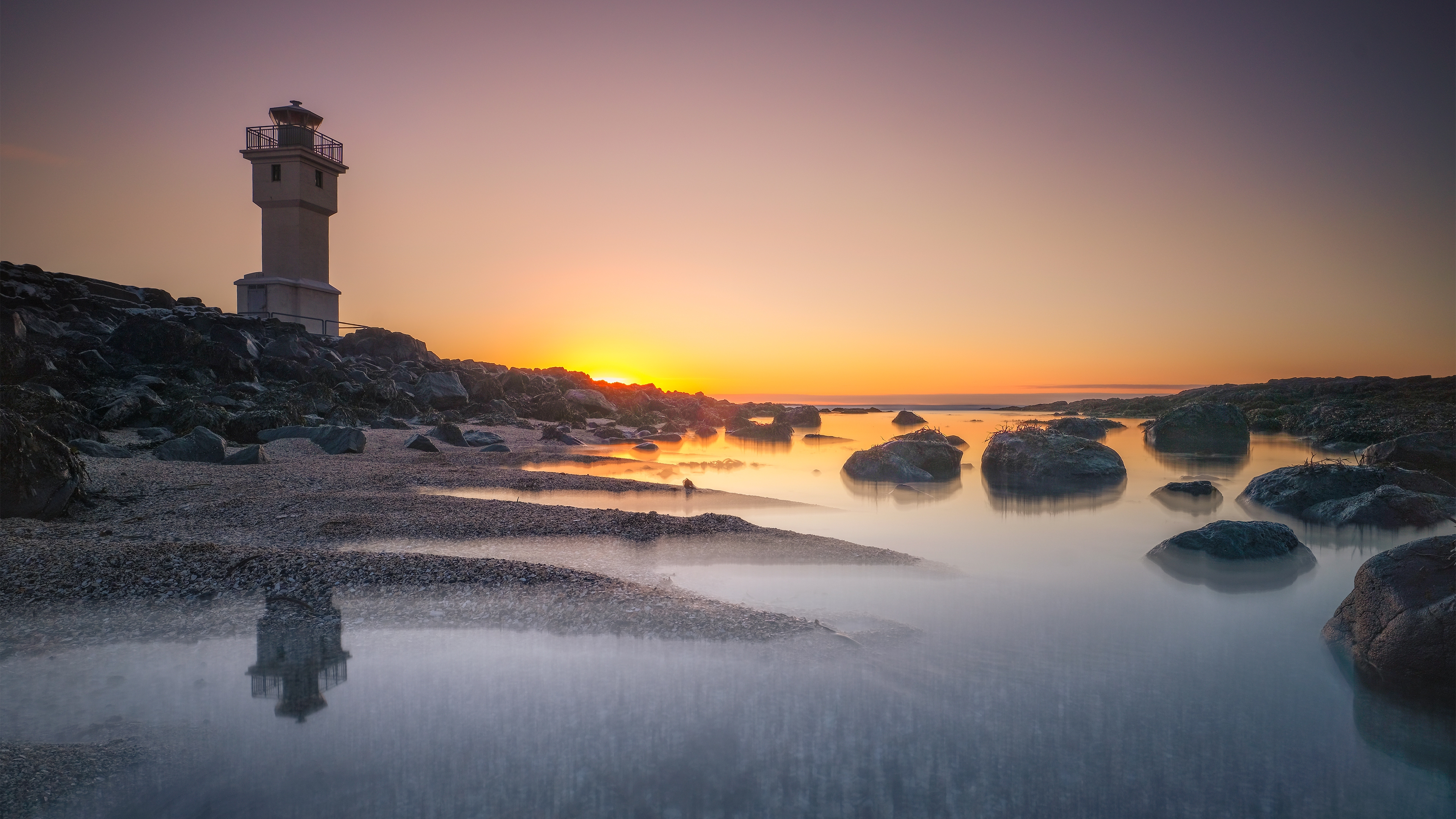 Description: A lighthouse on a rocky shore at sunset with a body of water in the foreground and rocks in the foreground.