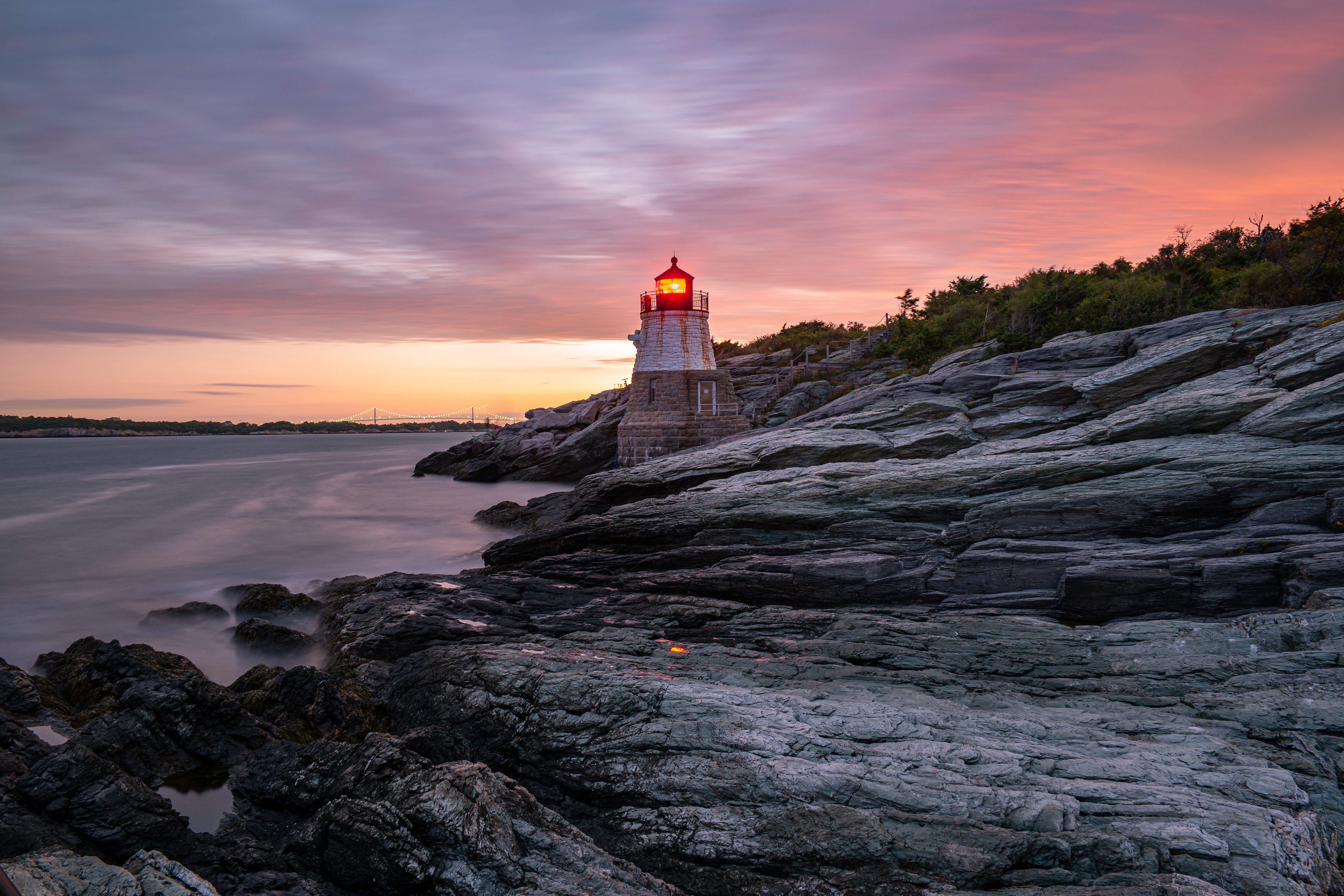 Description: A lighthouse on a rocky shore with a sunset in the background and a body of water in the foreground.
