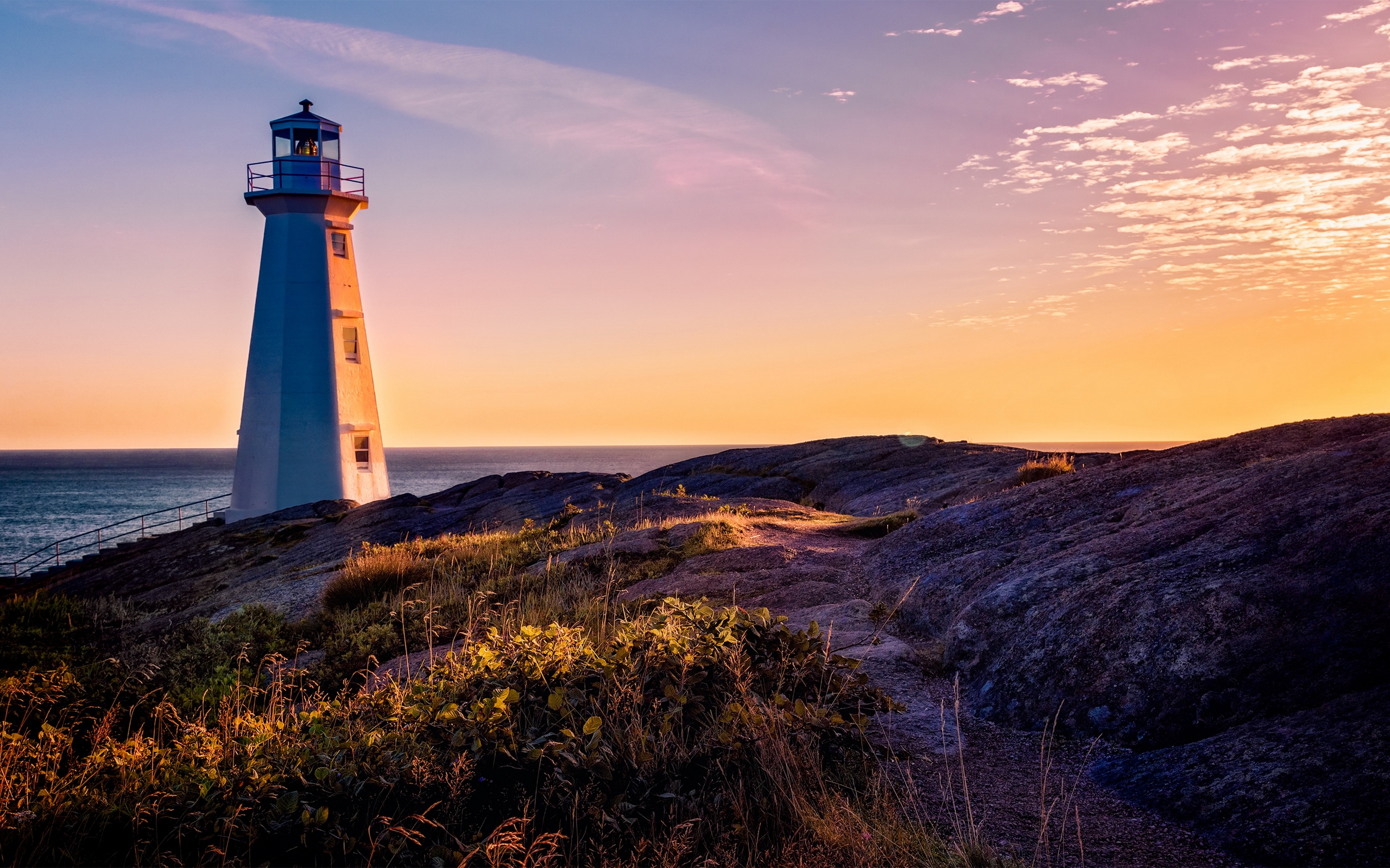 Description: A lighthouse on a rocky cliff overlooking the ocean at sunset or sunrise or dawn with a pink sky and clouds.