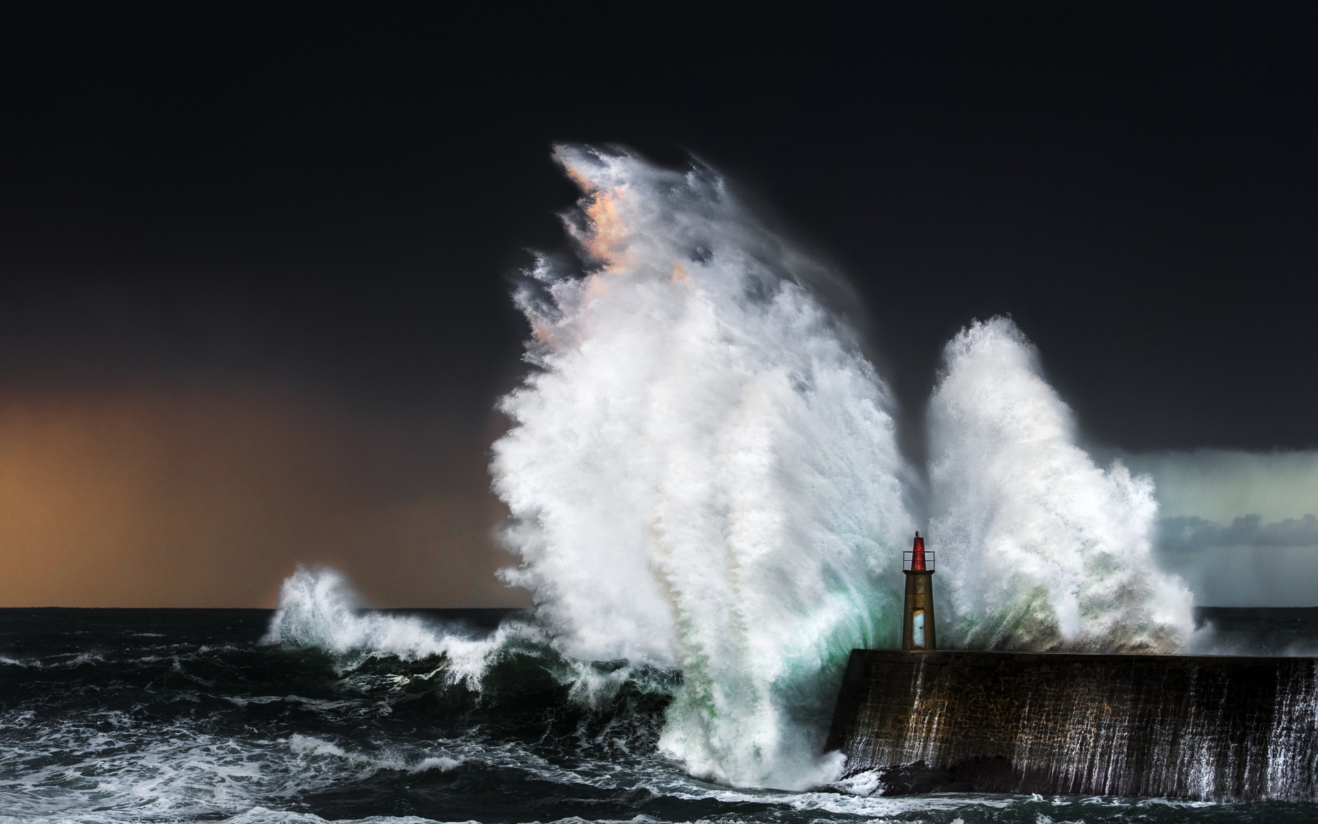 Description: A lighthouse is surrounded by a huge wave in the ocean with a lighthouse in the distance on a pier.