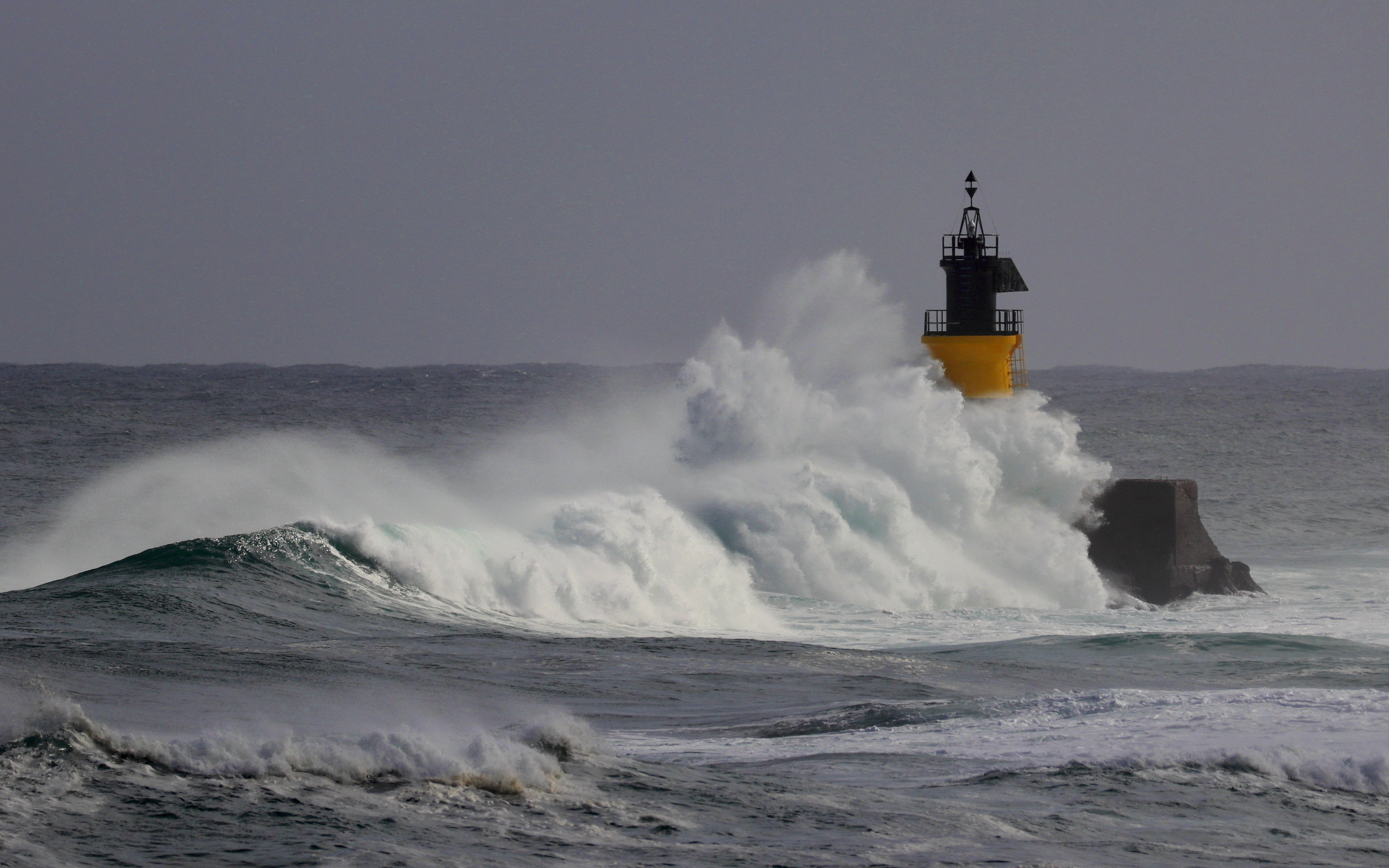 Description: A lighthouse is shown in the middle of a large wave in the ocean with a yellow light house in the background.