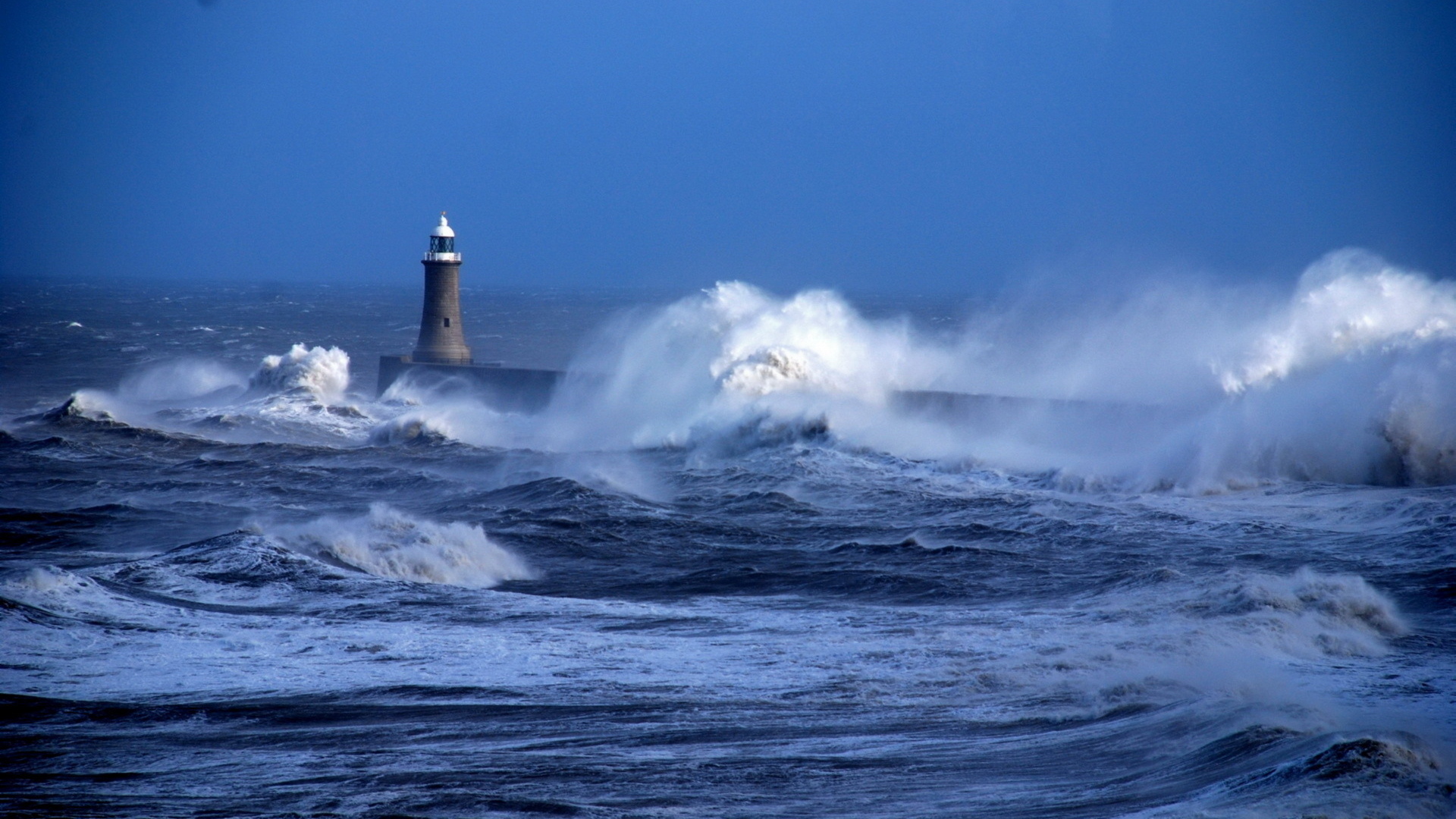 Description: A lighthouse surrounded by rough waves in the ocean on a clear day with a blue sky above it and a bird flying over it.