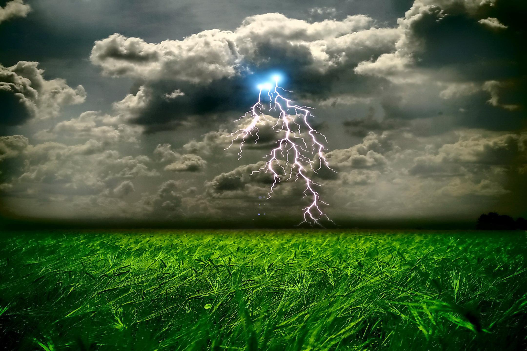 Description: A lightning bolt is seen in the sky above a field of grass with a dark cloud in the background.