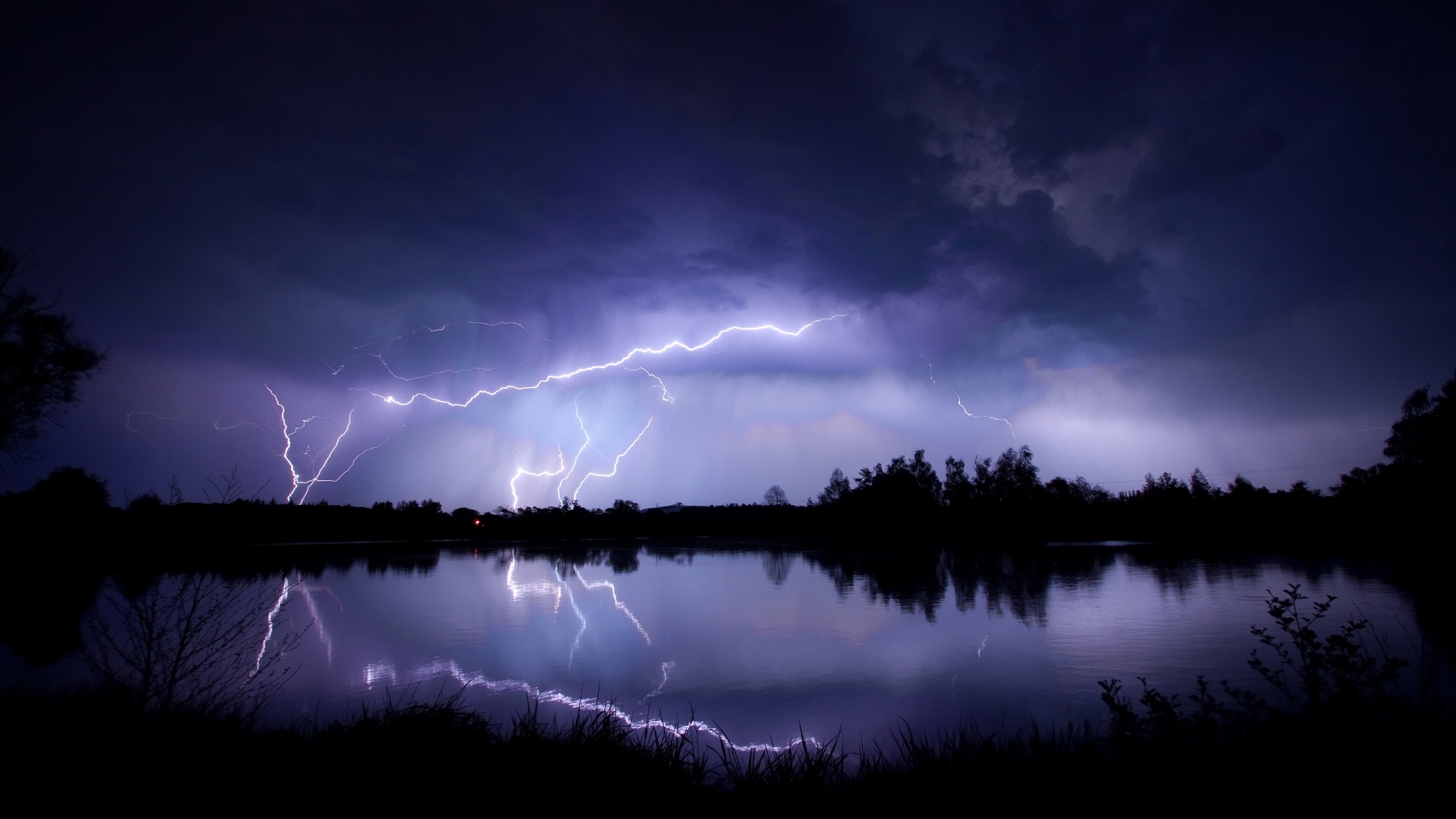 Description: A lightning storm is seen over a lake at night time with a reflection of the water and trees in the foreground.