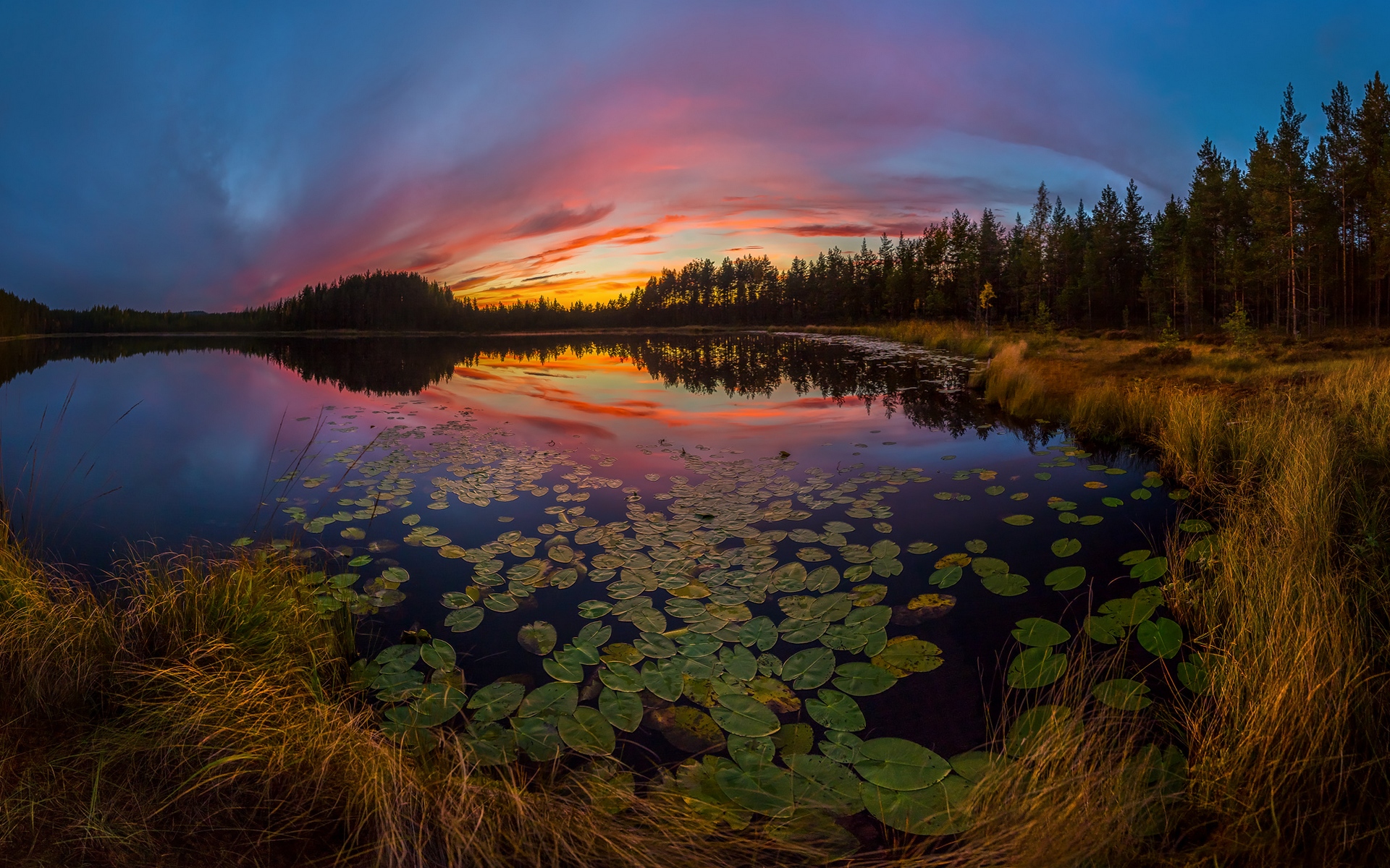 Description: A lake with lily pads in the foreground and a sunset in the background with clouds in the sky.