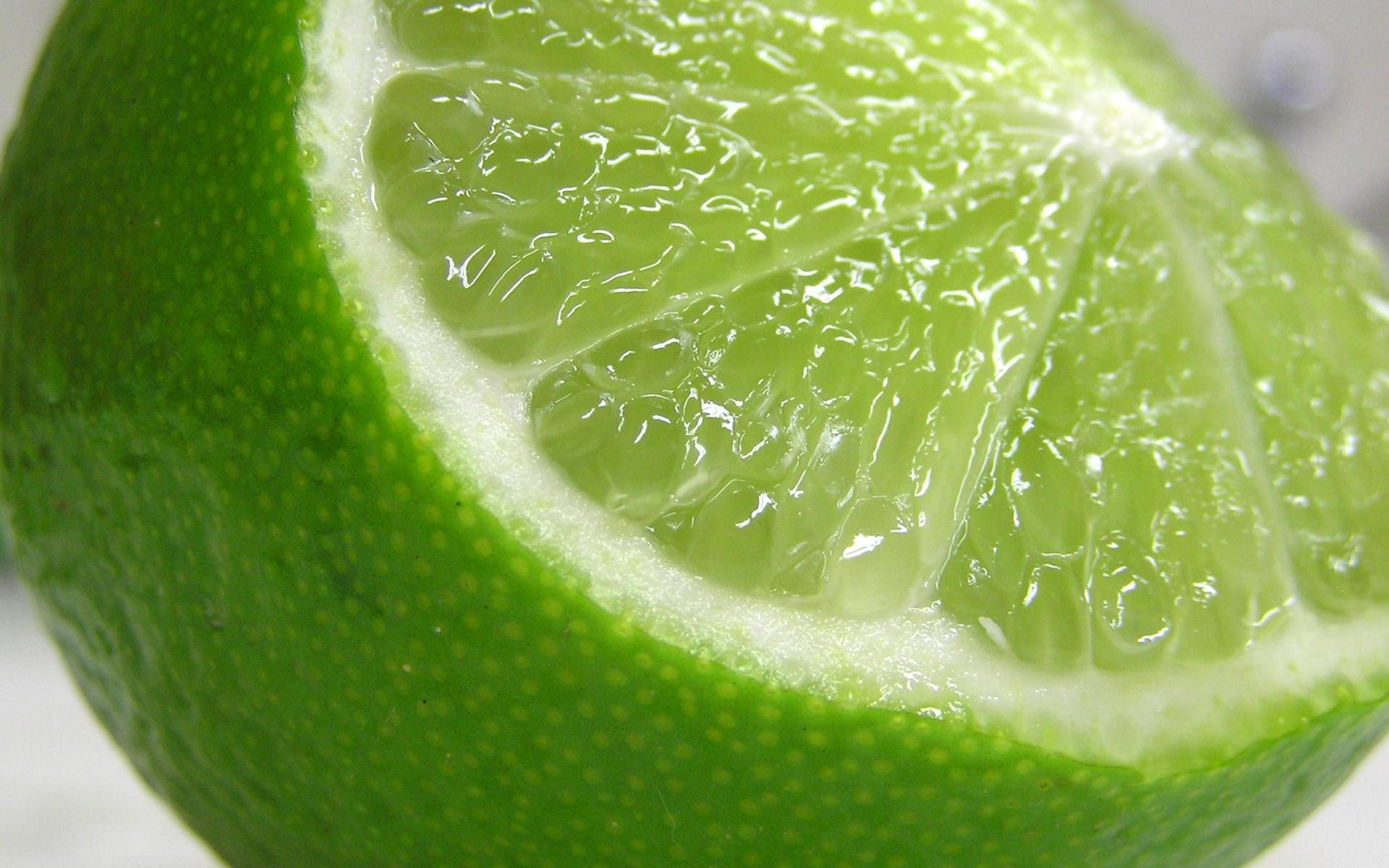 Description: A lime is cut in half on a table top with a knife and fork in it's mouth.