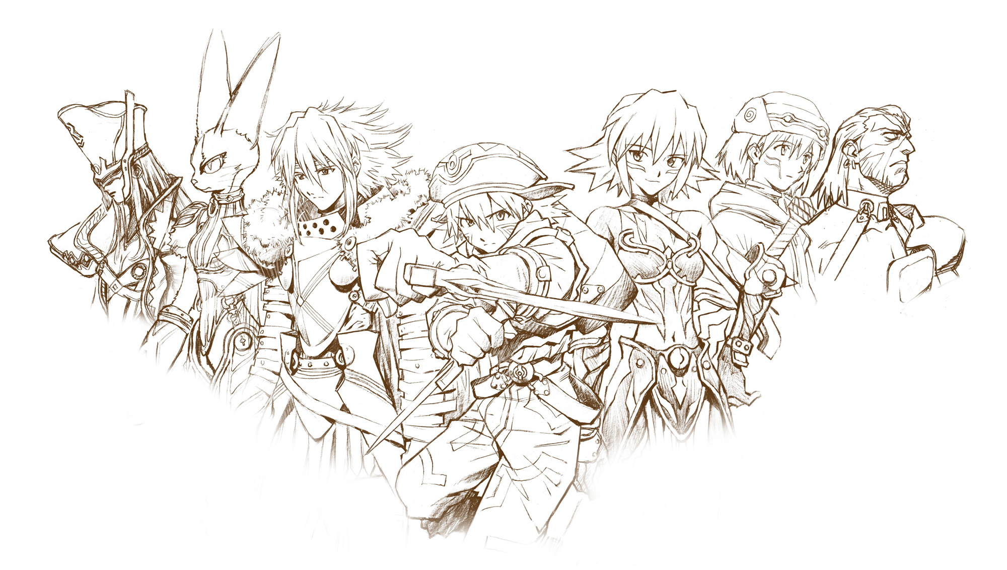 Description: A line drawing of a group of people with weapons and armor on their backs.