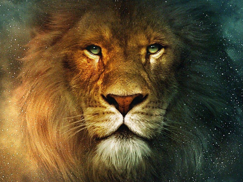 Description: A lion with a blue eyes and a black mane is shown in the foreground of a picture of a star filled sky.