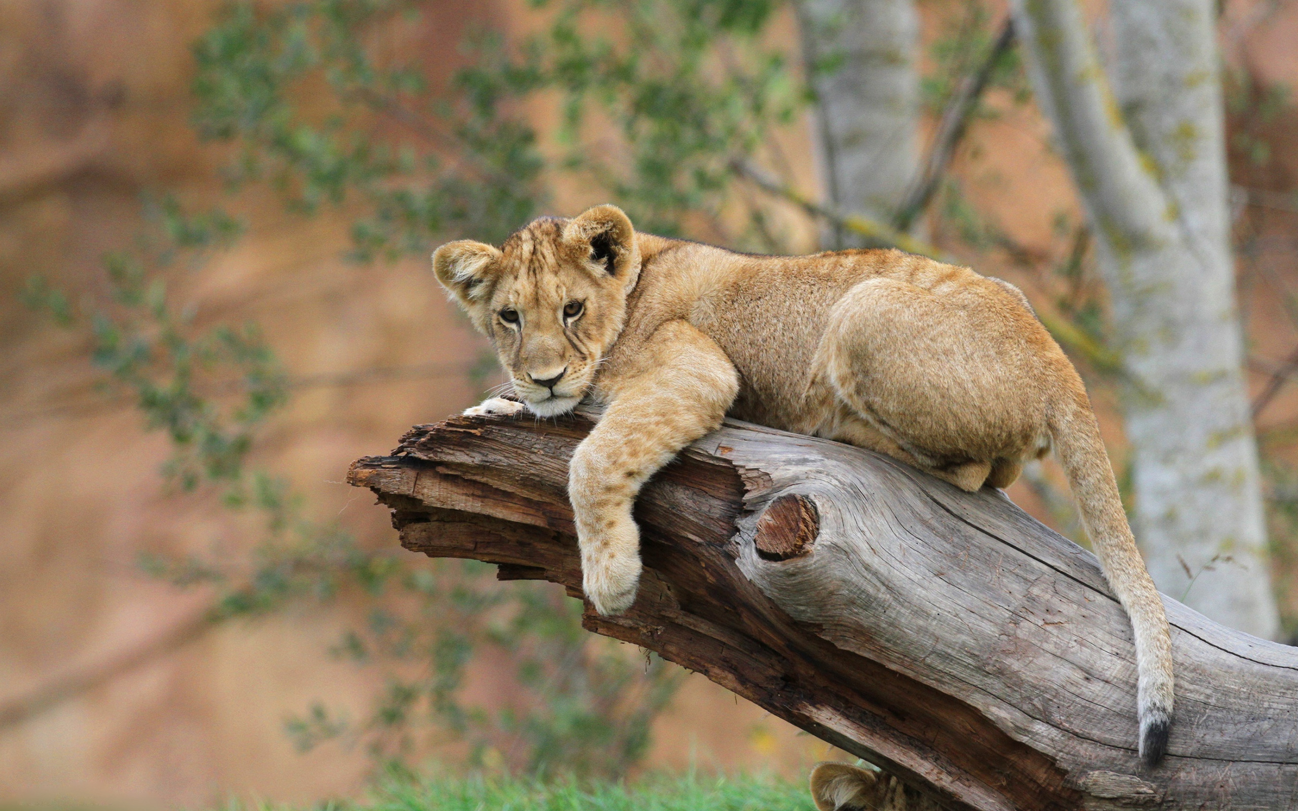 Description: A lion cub sitting on a log in a zoo enclosure at the zoo.