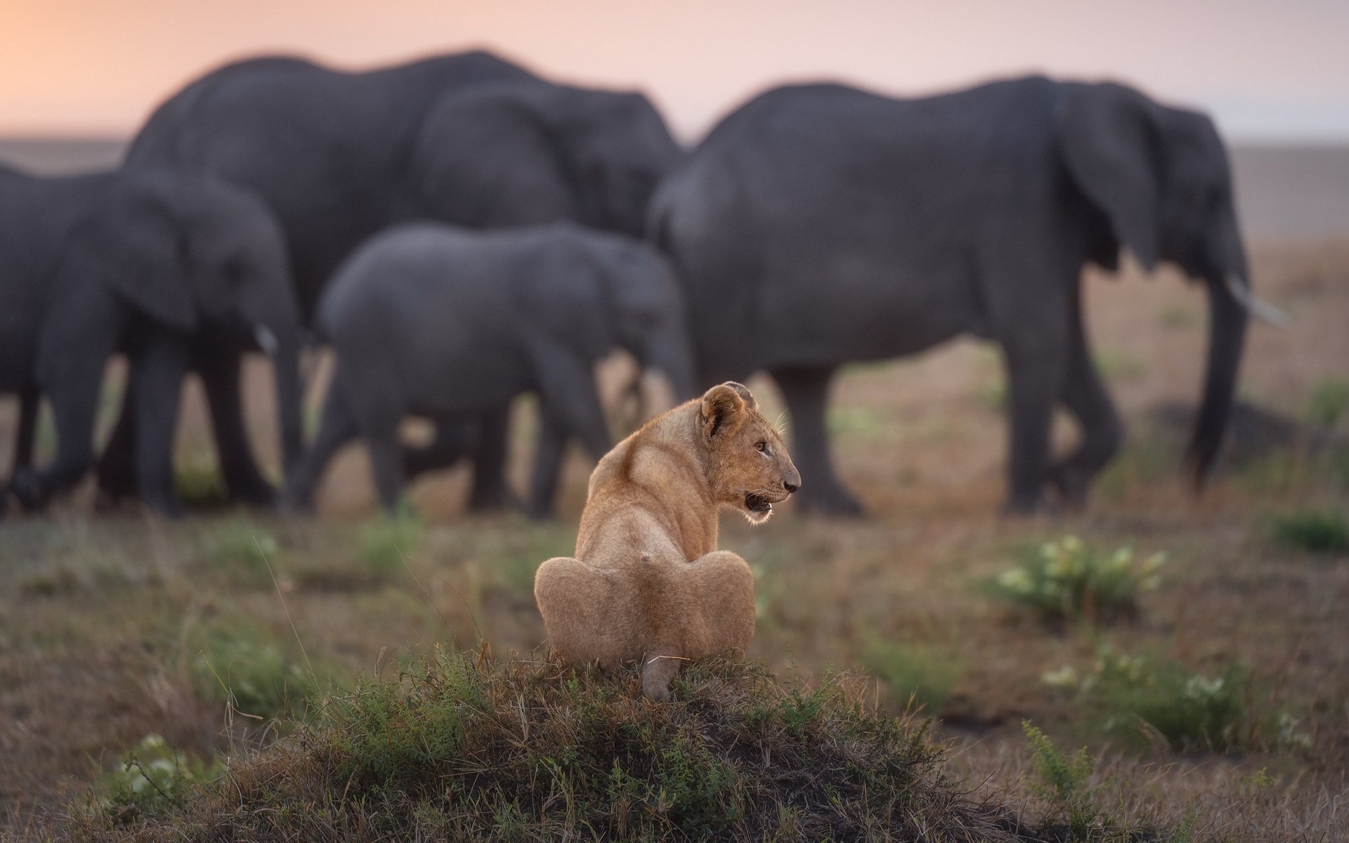 Description: A lion sitting in the grass with a herd of elephants behind him in the background.