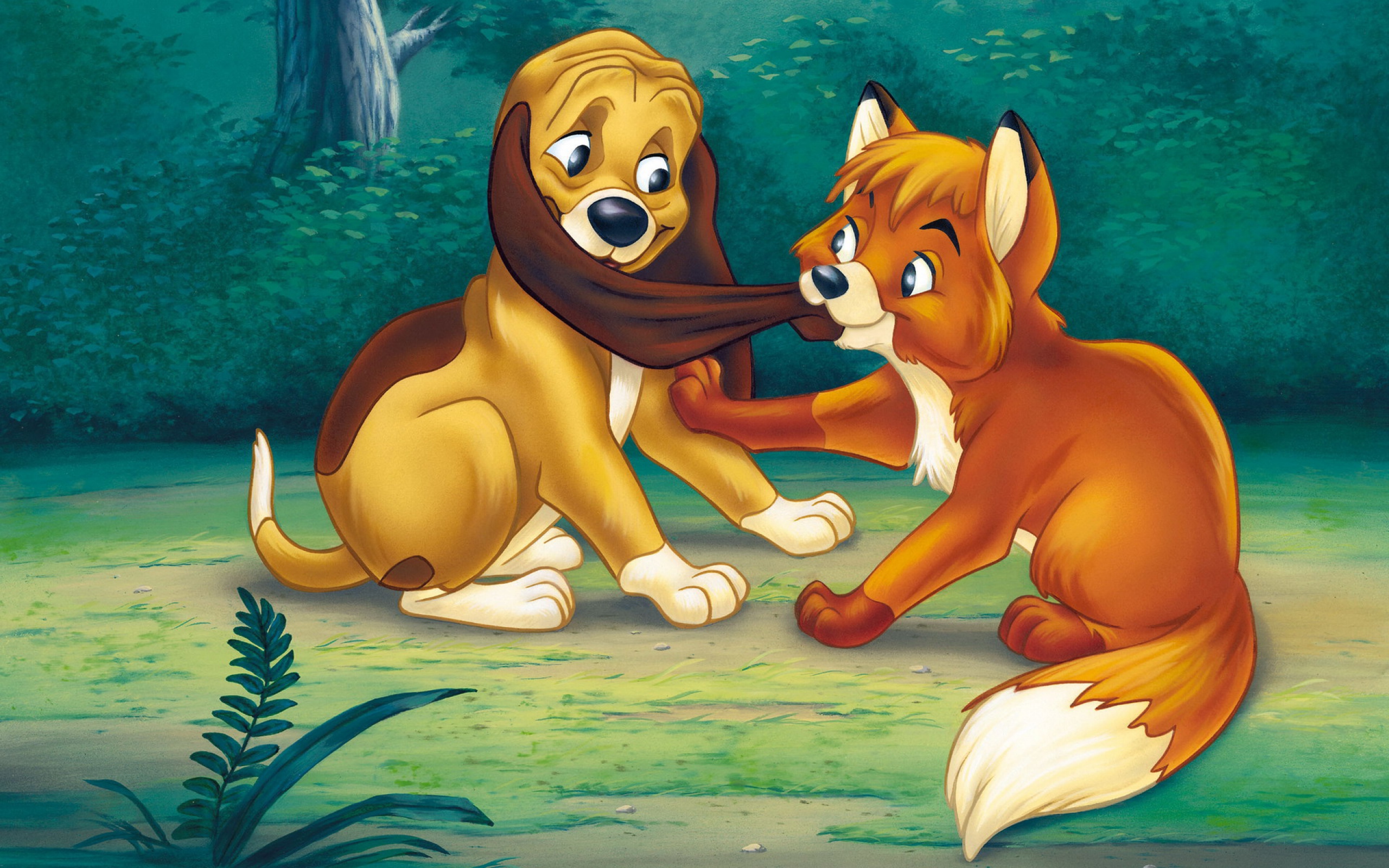 Description: A lion and a fox playing in the woods together with each other and a dog looking at the camera.