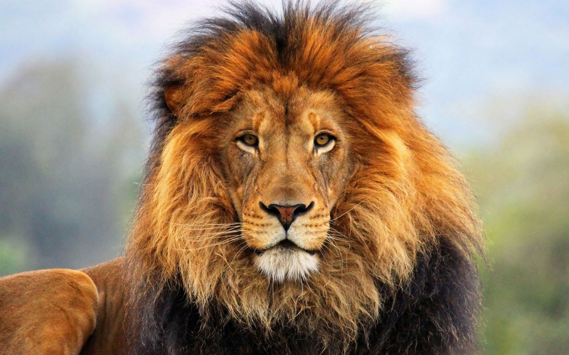 Description: A lion with a long mane and a black face and brown eyes looks at the camera with a blurry background.