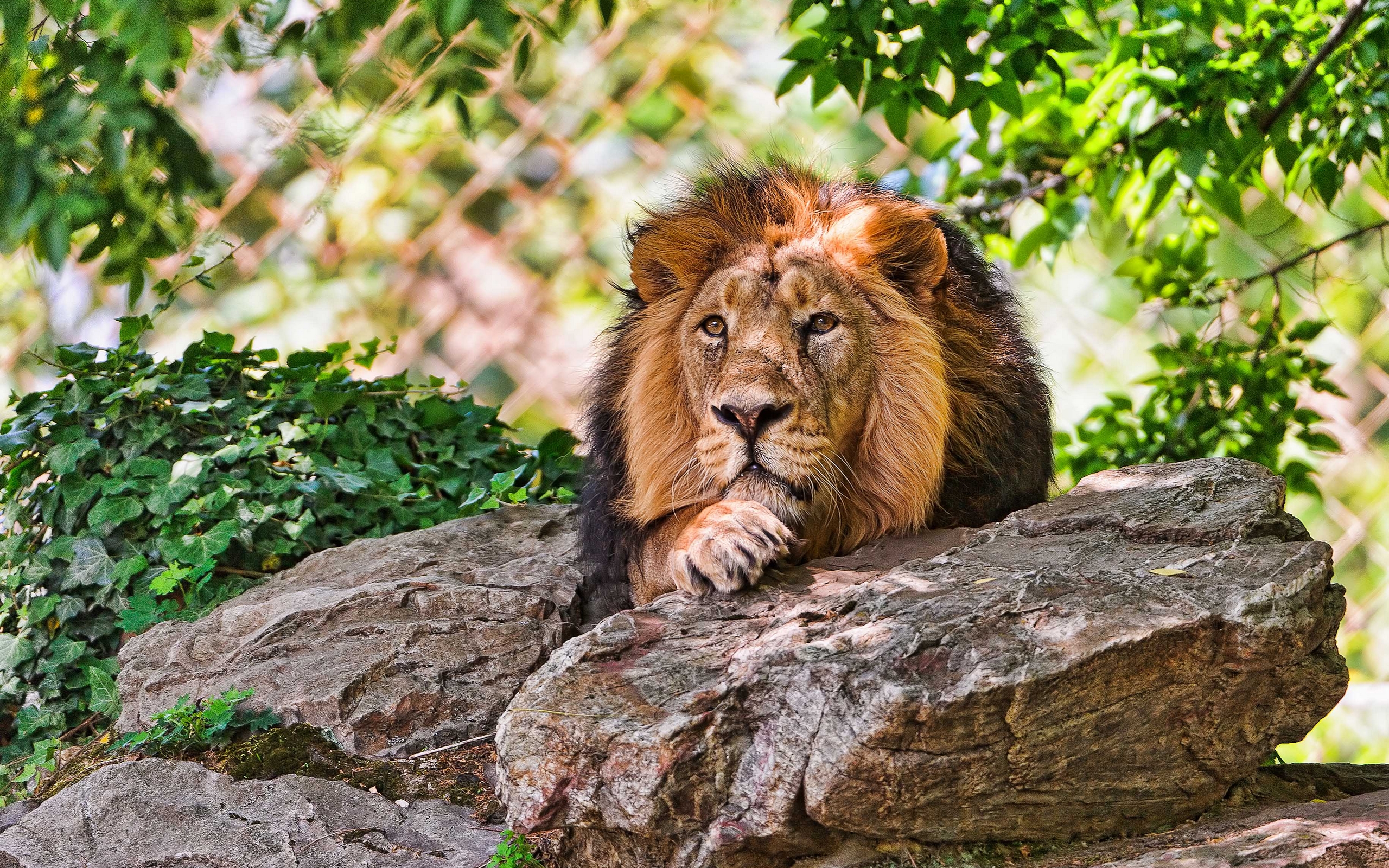 Description: A lion laying on top of a rock next to a tree and bushes in a forest area with a chain link fence.