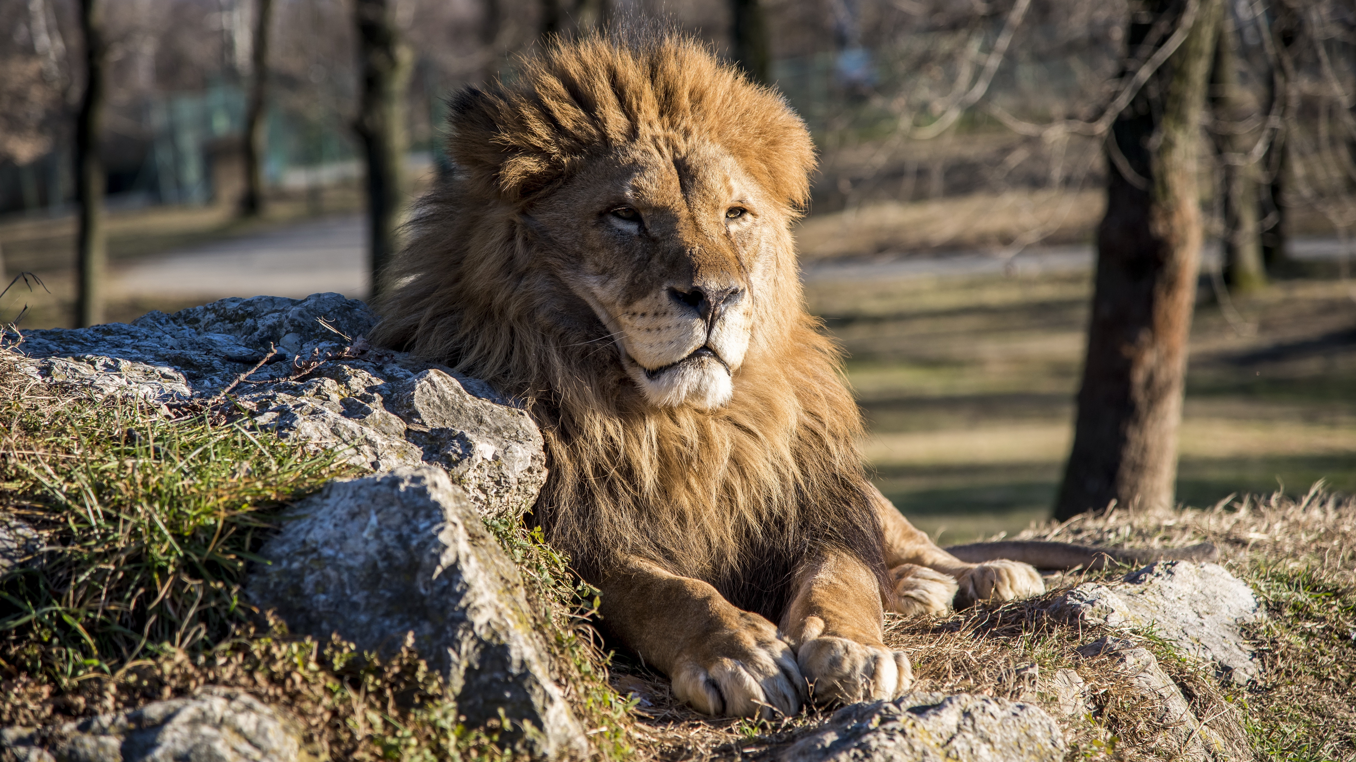 Description: A lion laying on a rock in a park with trees in the background and a path in the foreground.