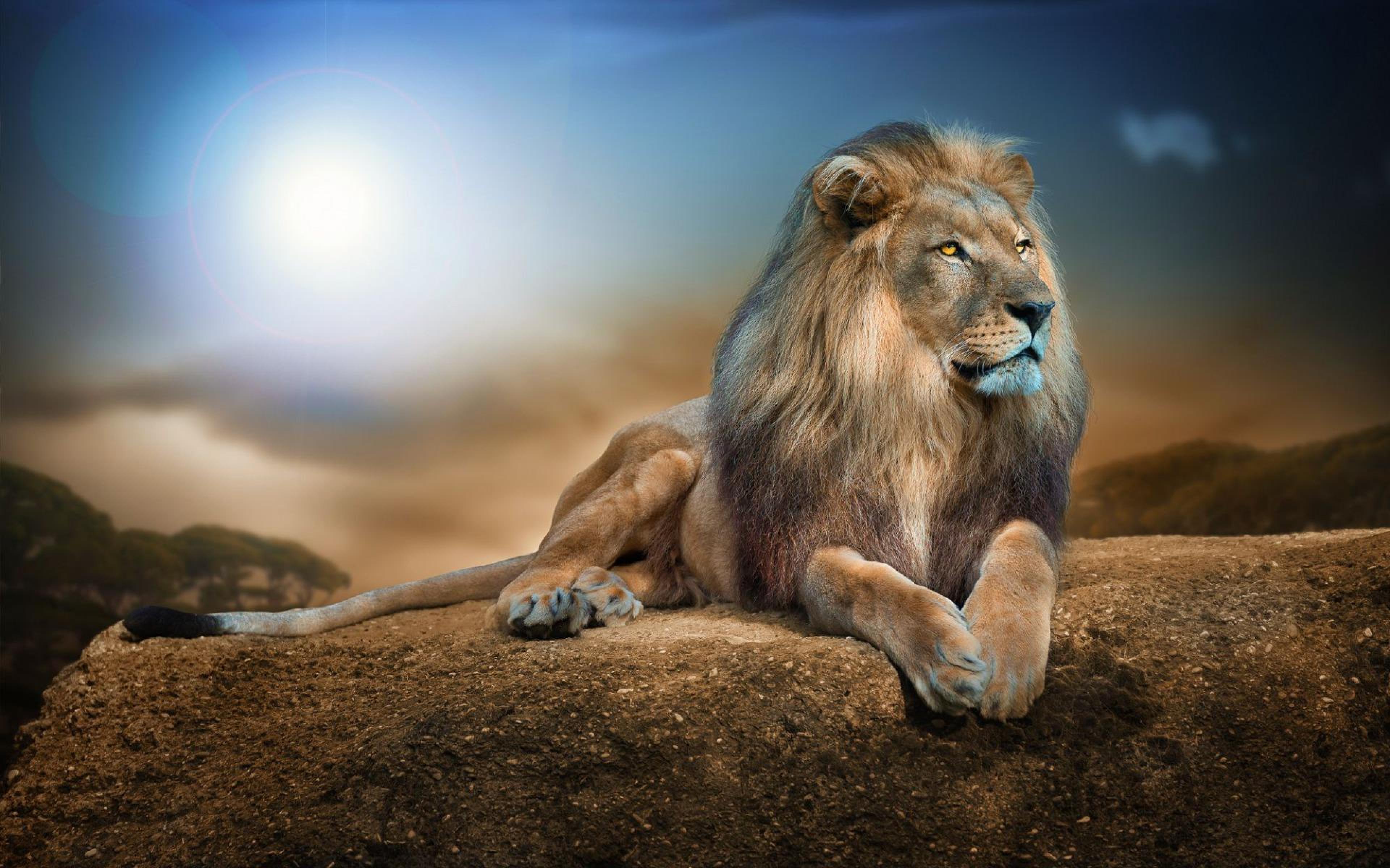 Description: A lion sitting on a rock with a sky background and clouds in the background.