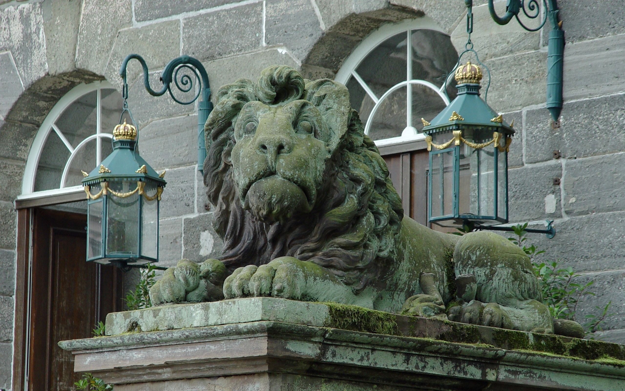 Description: A lion statue sitting on top of a stone building next to a lamp post and a window with a large arched window.