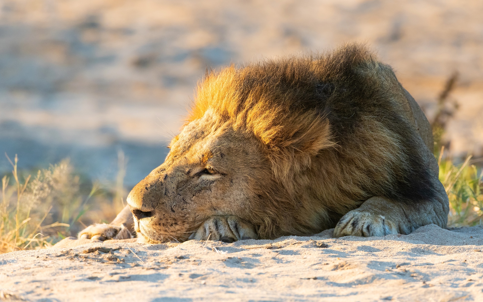 Description: A lion laying down on the ground in the sun with its eyes closed and his head resting on the ground.