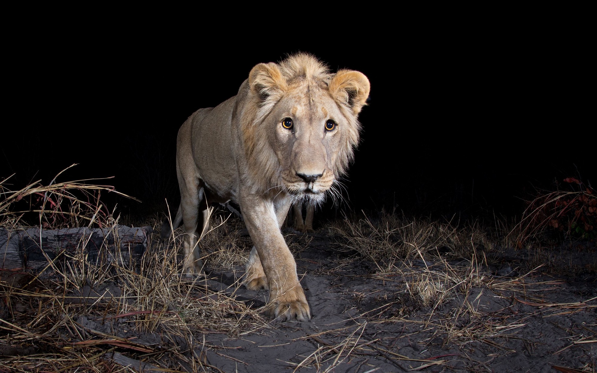 Description: A lion walking through a dark area with grass and bushes on the ground and a black background with a light on.