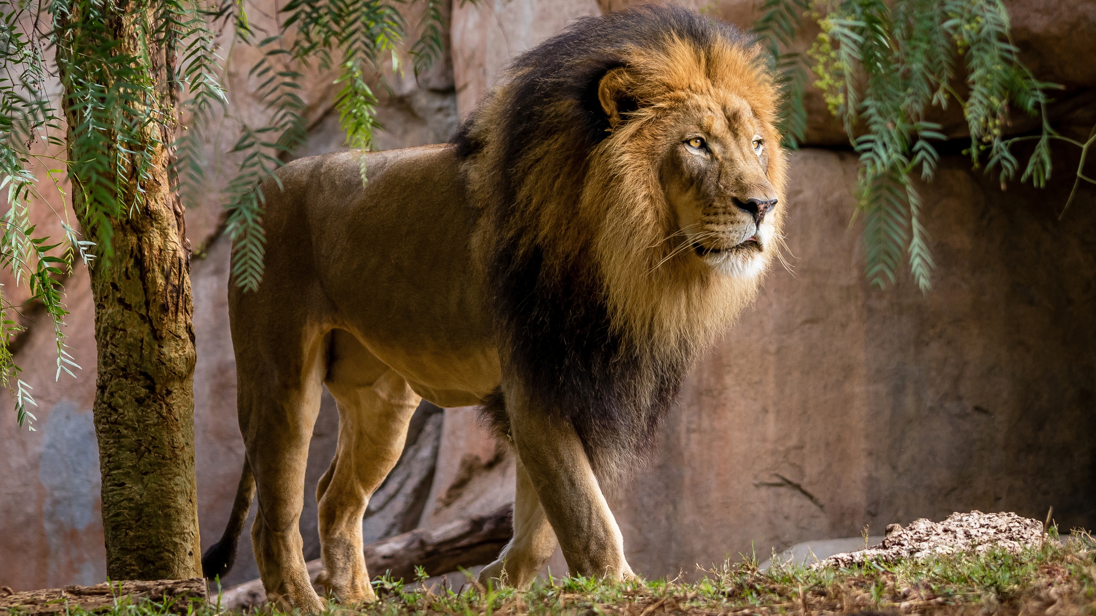 Description: A lion standing in a zoo enclosure next to a tree and rocks and plants on the ground and a rock wall behind it.