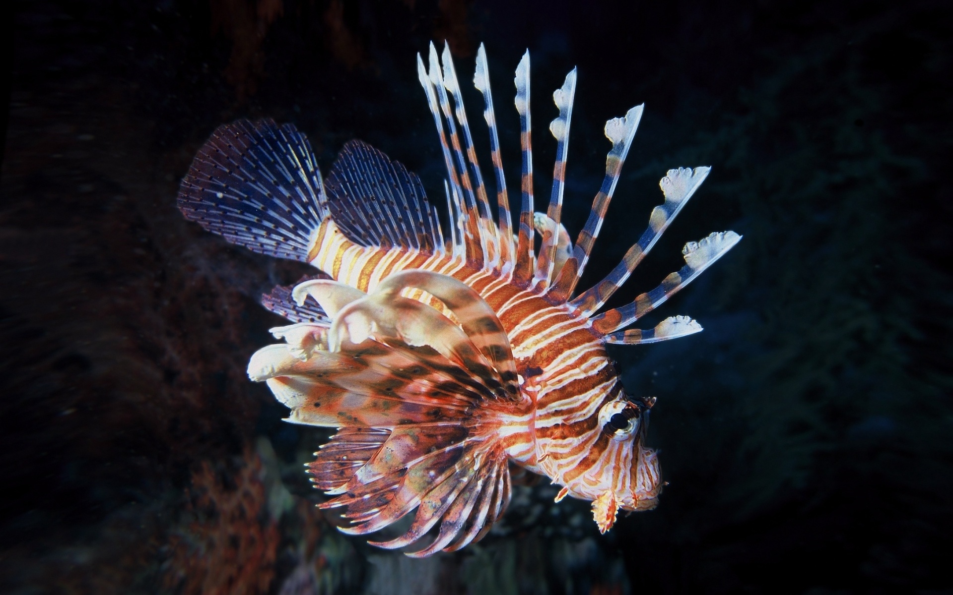 Description: A lionfish swimming in the water near a coral reef in the ocean at night time.