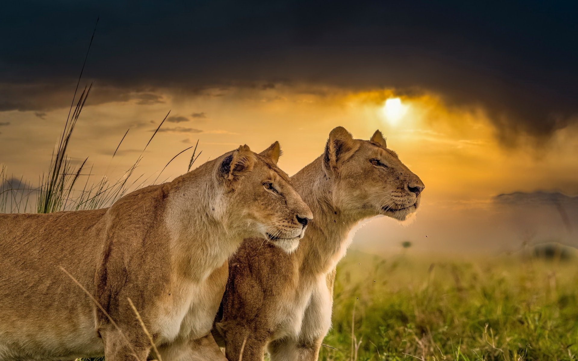 Description: Two lions standing in a field with a sunset in the background and clouds in the sky above them.