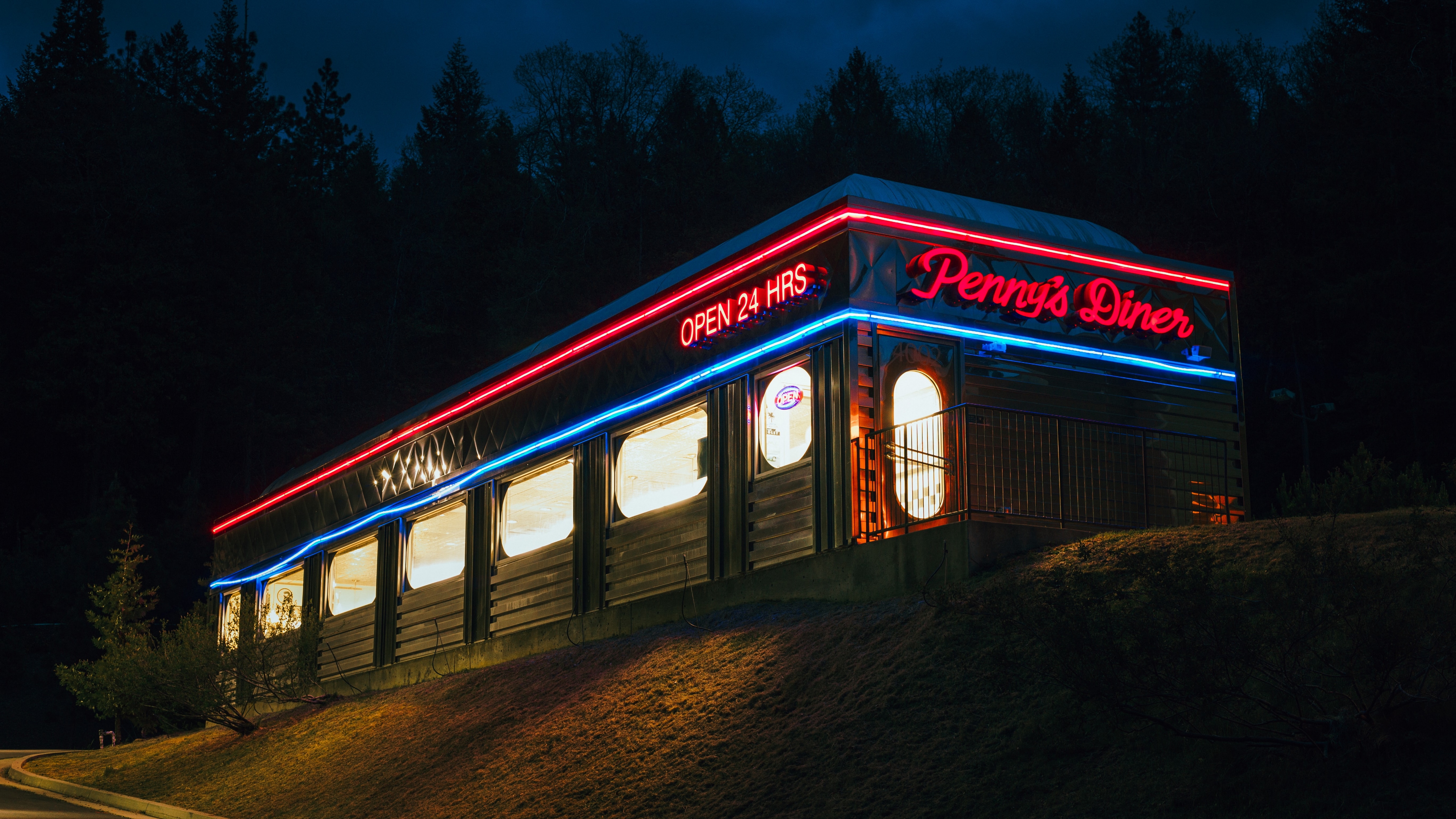 Description: A lit up building with a red and blue sign on it's side at night time with trees in the background.