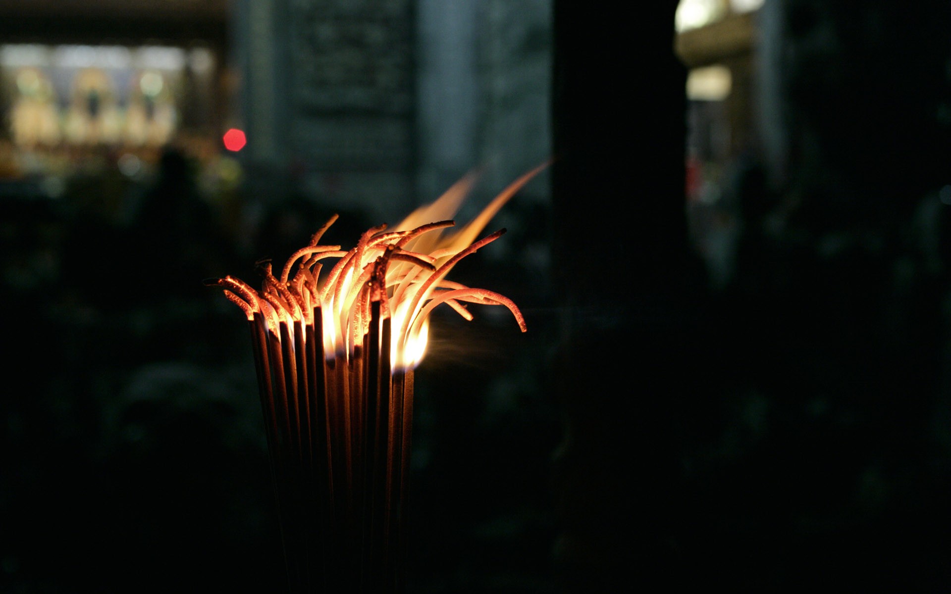 Description: A lit candle with a dark background and a blurry image of people in the background in the background.