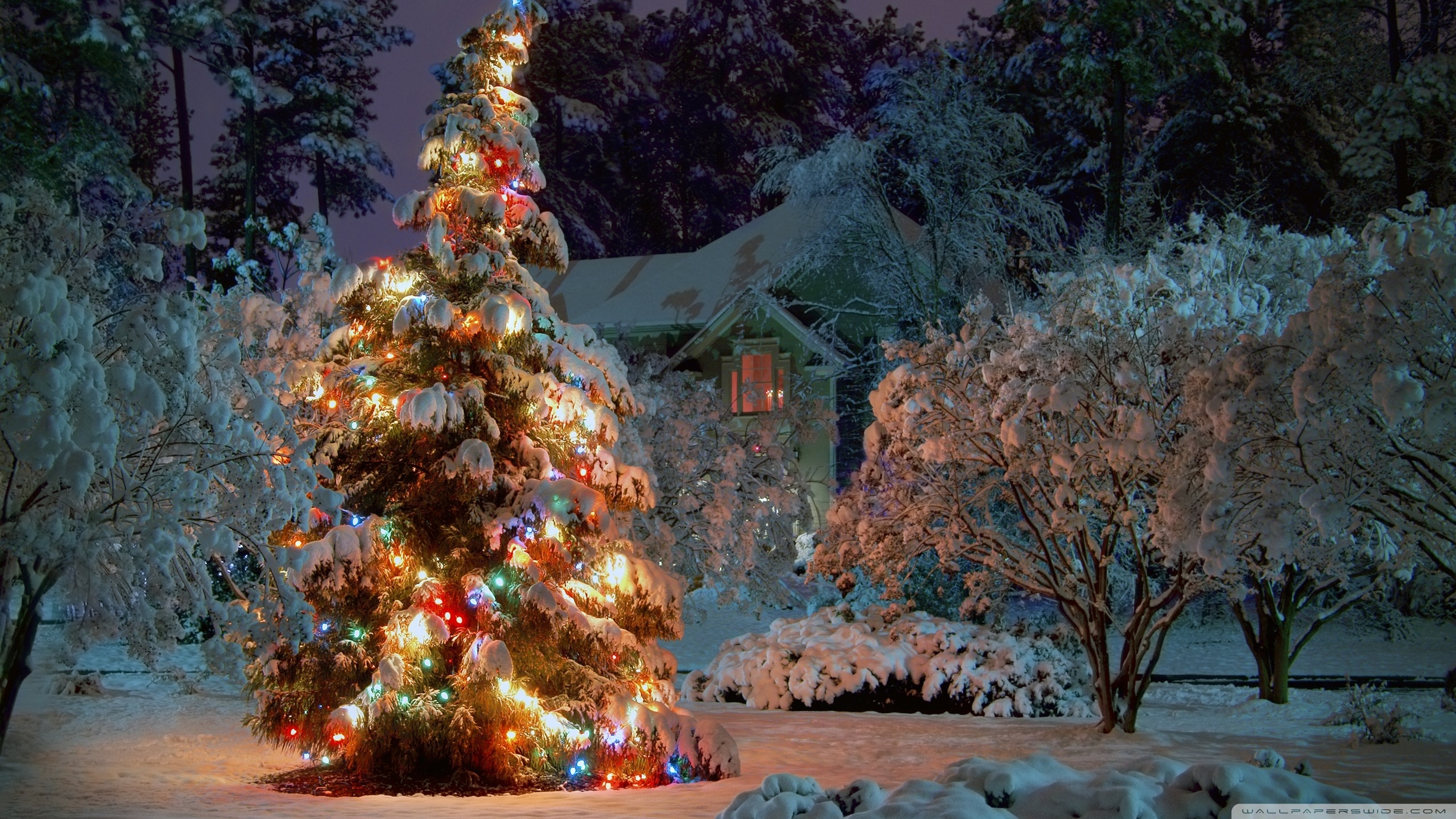 Description: A lit christmas tree in a snowy yard at night with a house in the background and trees covered in snow.