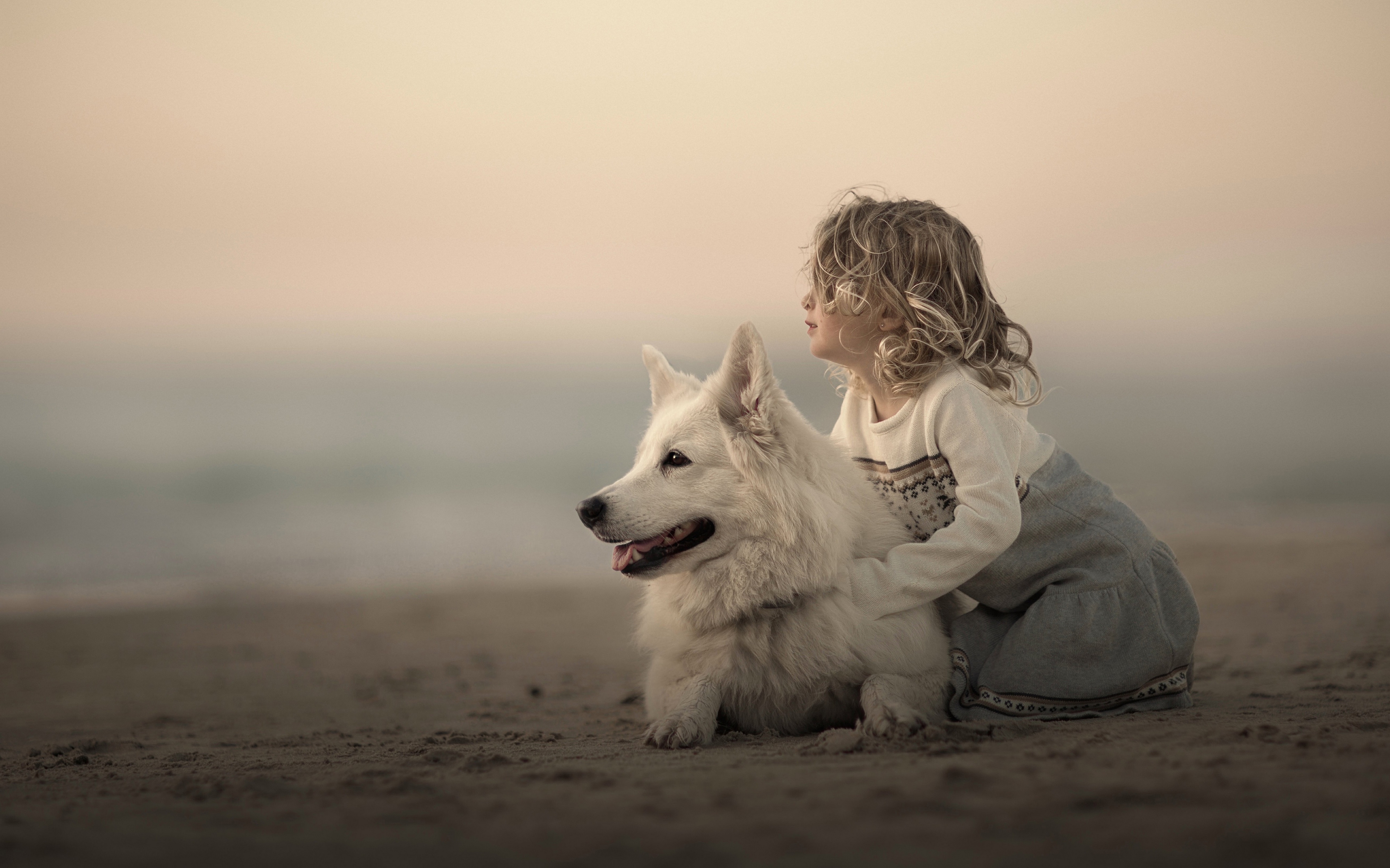 Description: A little girl sitting on the beach with a dog next to her on a cloudy day with a sky background.