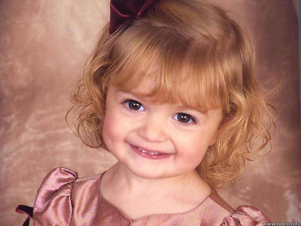 Description: A little girl with a big bow on her head smiling for a picture in a pink dress with a brown background.