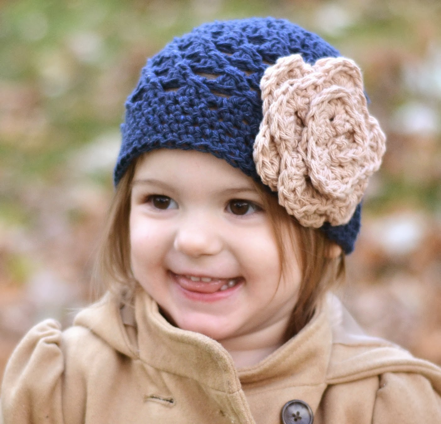Description: A little girl wearing a blue hat with a flower on it's side and smiling at the camera.